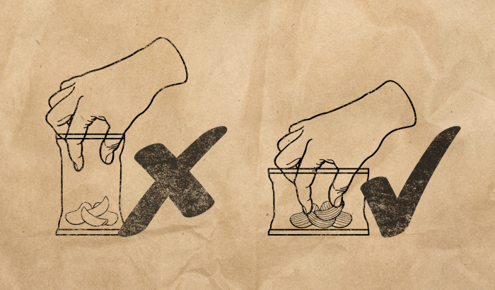 The big idea wasn’t in the graphics, but in the structure of the packaging. We decided that the bag should open on its longest side, contrary to conventional chips bags. This means the bag remains exactly the same size as before, but the opening is extended by a whole two inches, making it the ideal pack for big-handed men.