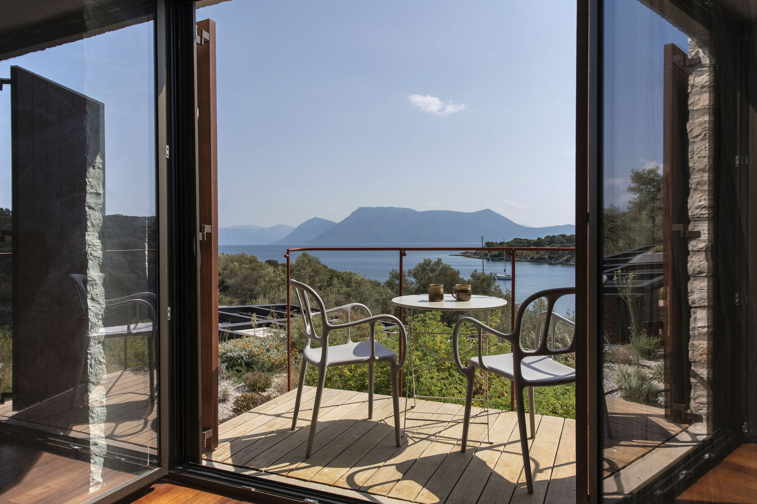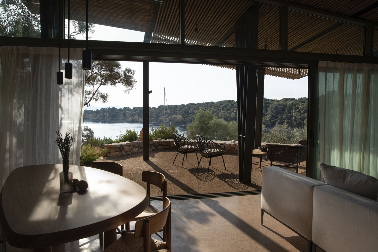 A bold, striking steel canopy contrasts the almost archaeological existing surface of the land and its habitation as a protecting layer above it. It delivers an aesthetic so regularly found in the shepherds’ sheds of the Mediterranean landscape, a thin cover parallel to the inclination of the ground. Everywhere you look with Meganisi House there is an impressive design detail to appreciate and it really showcases the talents of the studio behind its build, Hiboux Architecture.