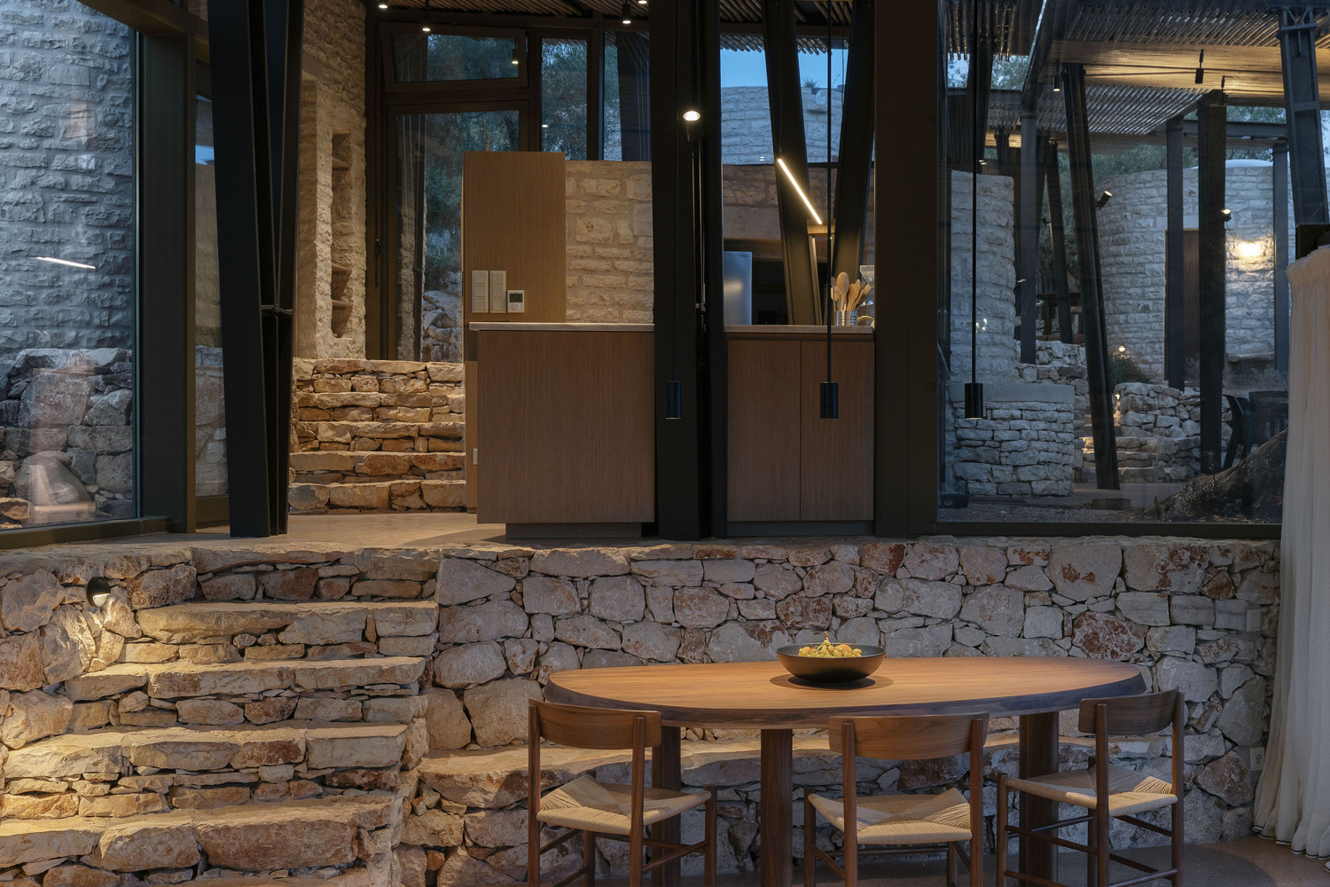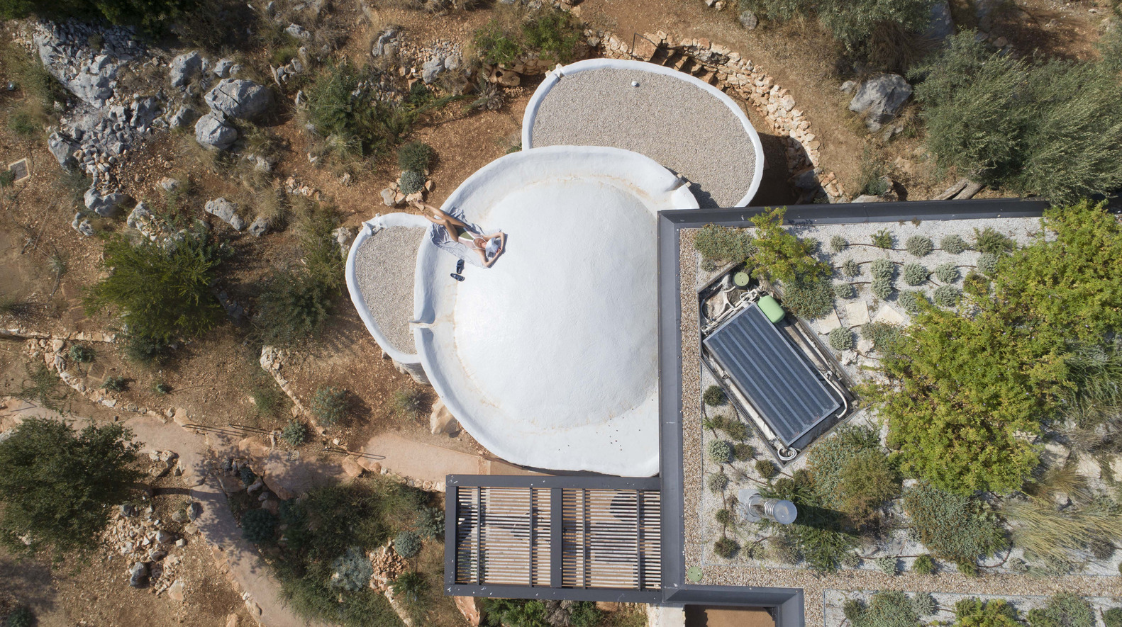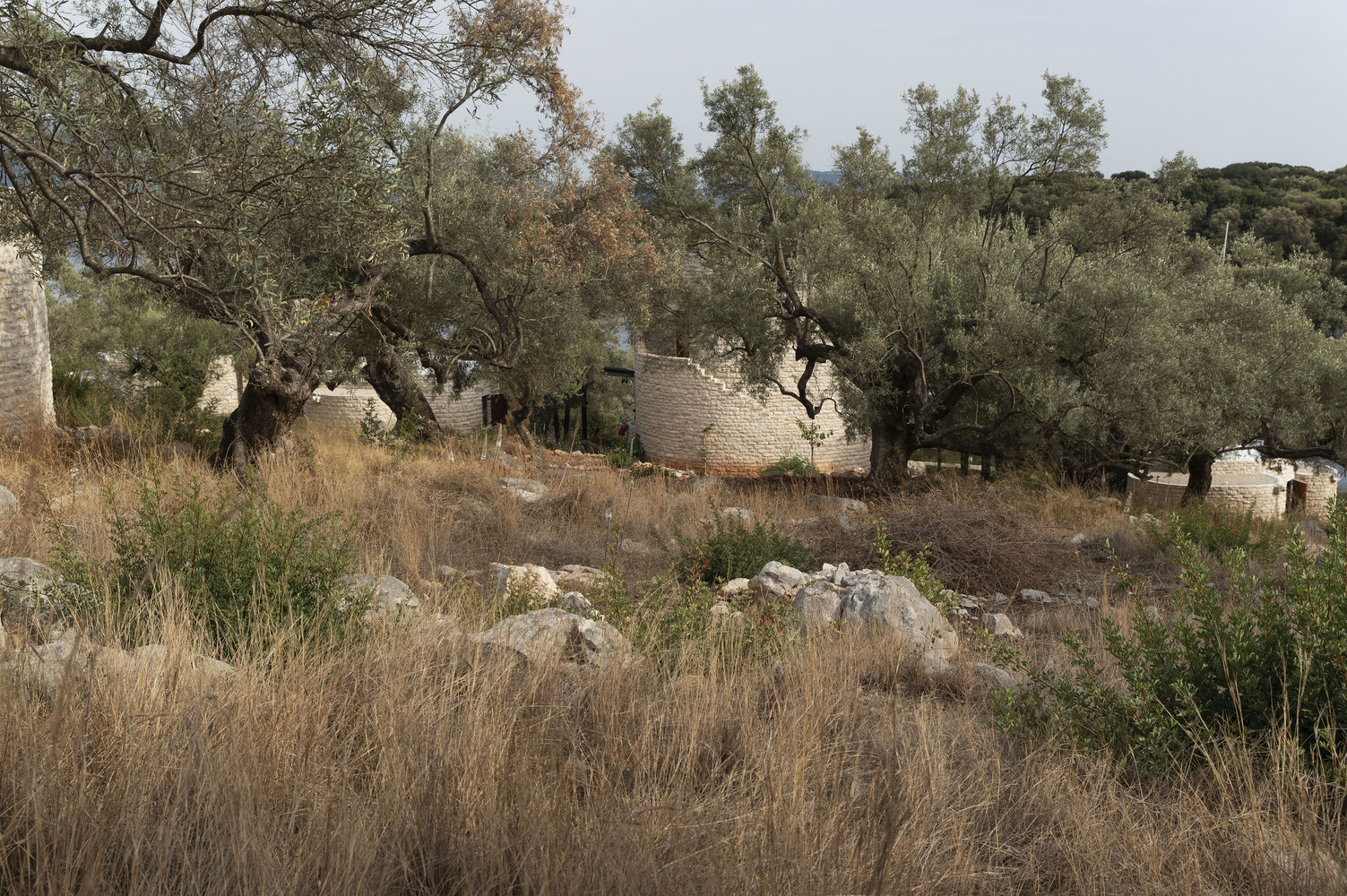 Cleverly conceived and executed, Meganisi House is located in Katomeri, Greece, and it is formed as a complex of scattered domed round volumes, and a square grid canopy that joins them together, amongst 42 existing olive trees on terraces retained by dry-stack walls (xerolithies). The design takes inspiration from the pastoral round stone dwellings seen in several places, among them in nearby Eglouvi, Lefkada, the stone volumes aim at conserving the terraced configuration of the ground.