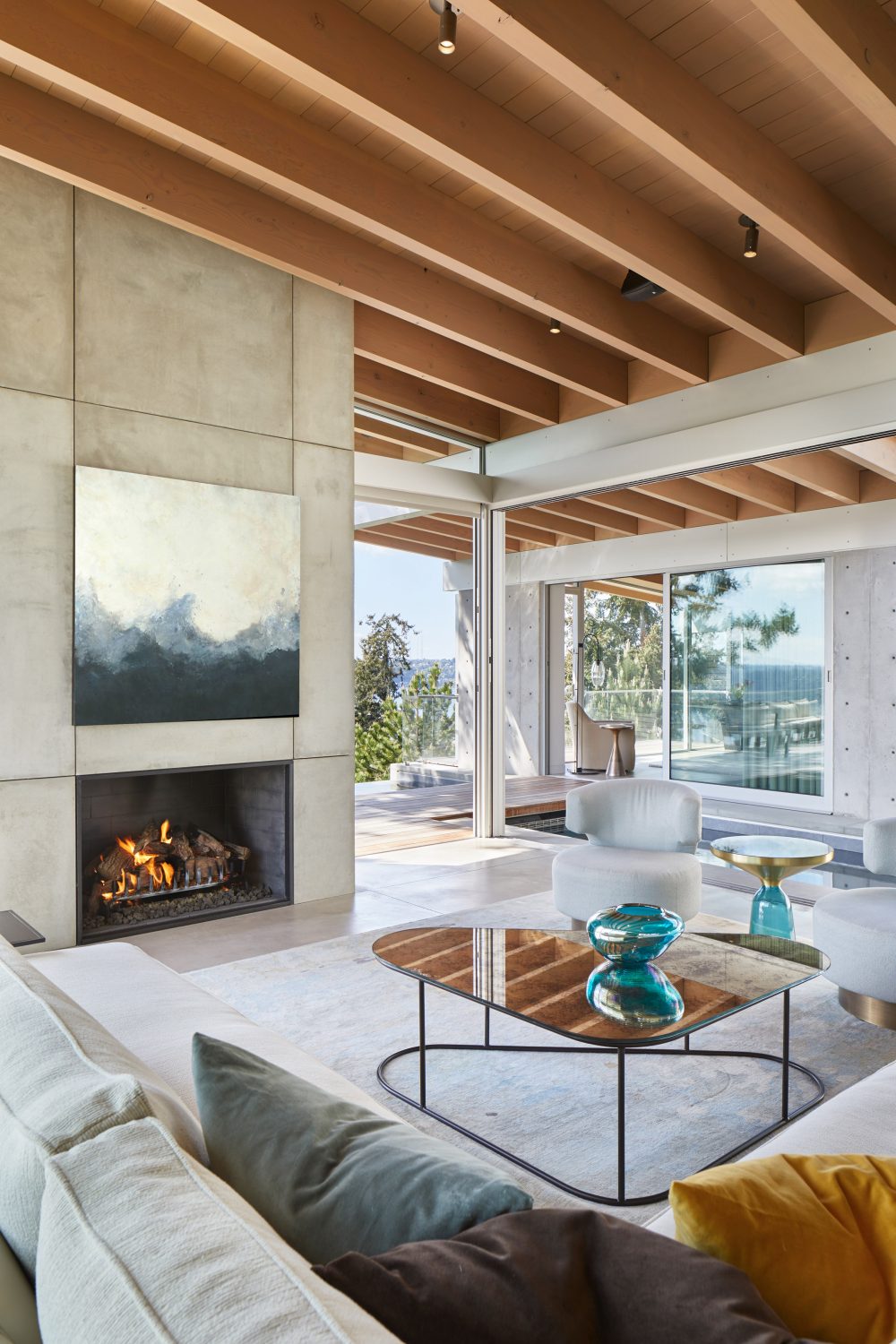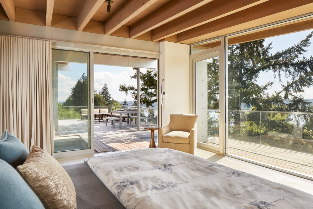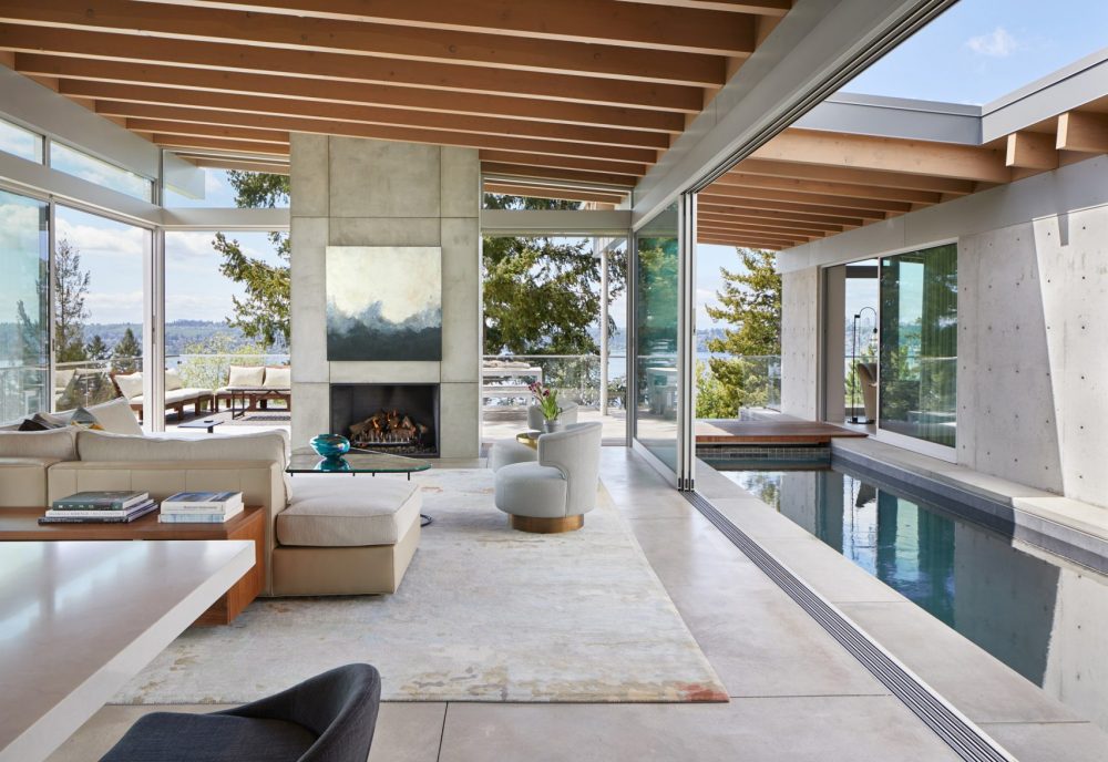 The experience of walking up to and over water, both inside and outside of the home, delivers a relaxing and tranquil feeling that one rarely experiences inside a residential building and it’s clear to see that Garret Cord Werner have done a magnificent job of hitting their brief of making water a focal point of this majestic, modern home on Lake Washington. It has an interior bridge which is enclosed by glass and leads from the foyer to the main living area, an open-concept kitchen, living and dining room with wraparound glass walls that deliver the amazing views out onto the lake.