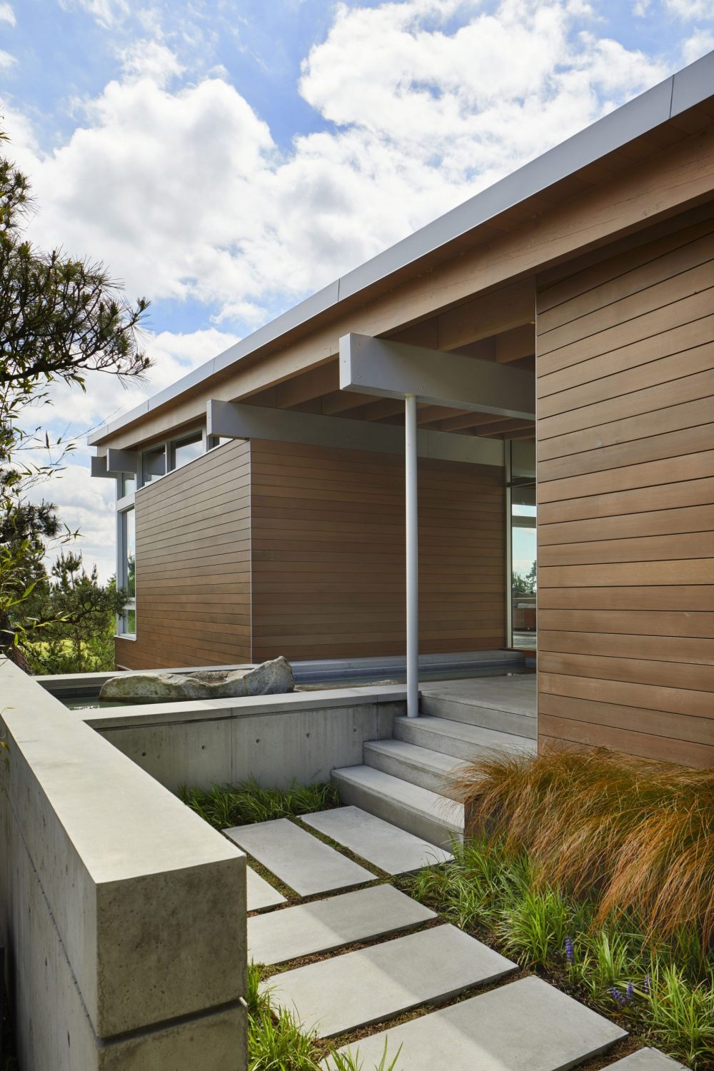 One of the most eye-catching features of the Mercer Island Residence is how it is traversed by a “spine” of water that divides the interior spaces and provides access to water to multiple different rooms in the home. There are two bridges, one covered and the other open to the elements, that span this divide and provide a compelling visual impact for anyone who visits the home for the first time. When driving up to the home, visitors pass by a reflective water feature that signals the entrance to the property.