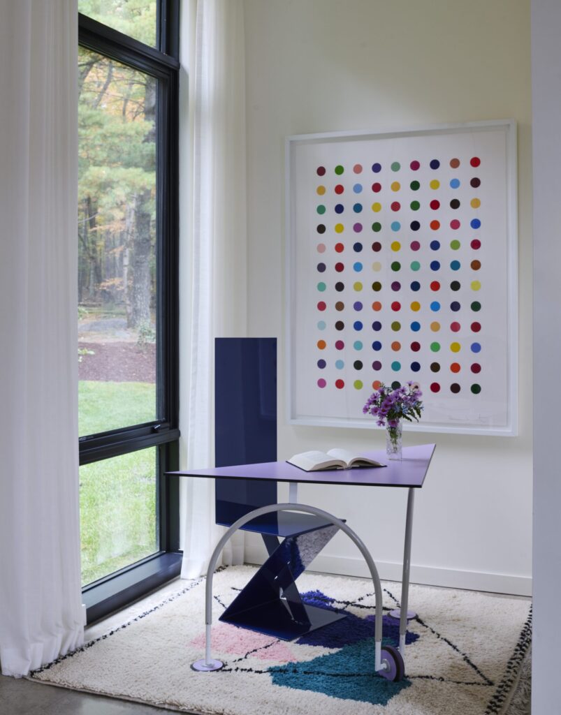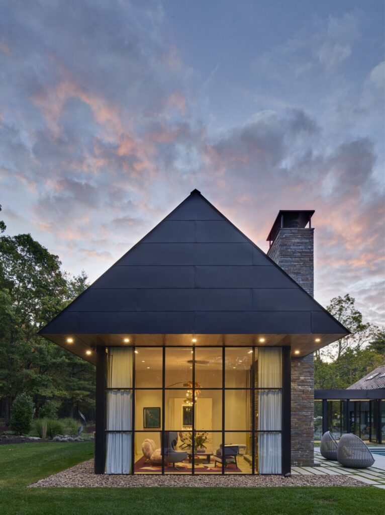 The custom-tiled pool, with its wading area and ample chaise lounges, explicitly references the iconic pools of David Hockney—a splash of artistic history in the middle of the woods. A pool house with a trellis roof covers a curved concrete table and a full outdoor kitchen, creating the ultimate setting for summer barbecues.
