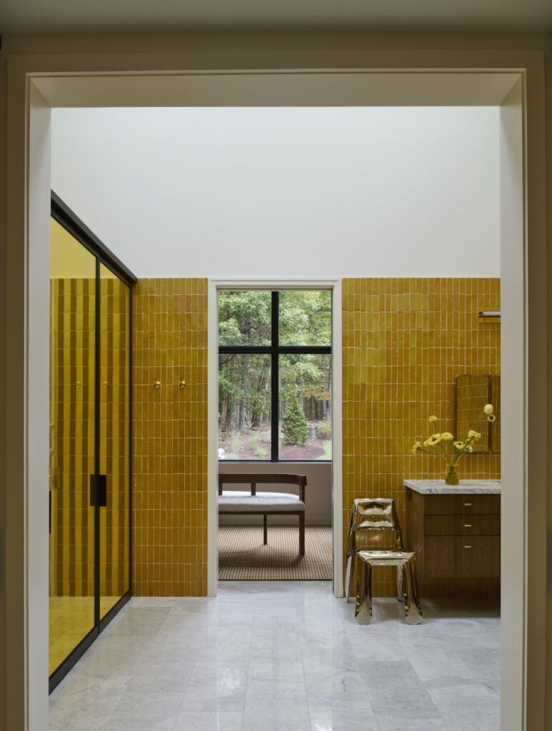 While the exterior of this wing maintains a private, minimalist black barn aesthetic, the interior is a revelation of light and color. It showcases the clients’ passion for design through custom millwork and distinctive bathroom tiling.