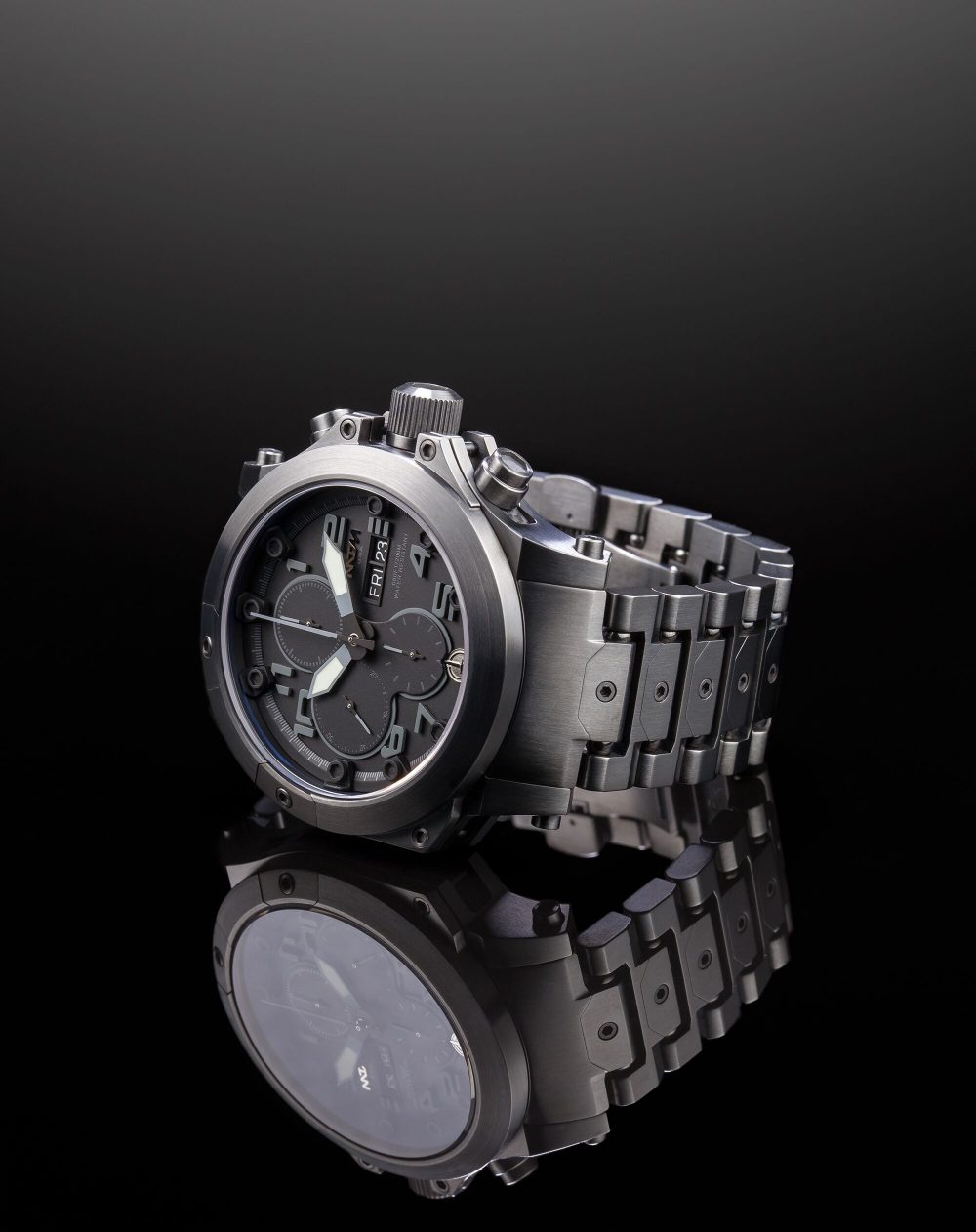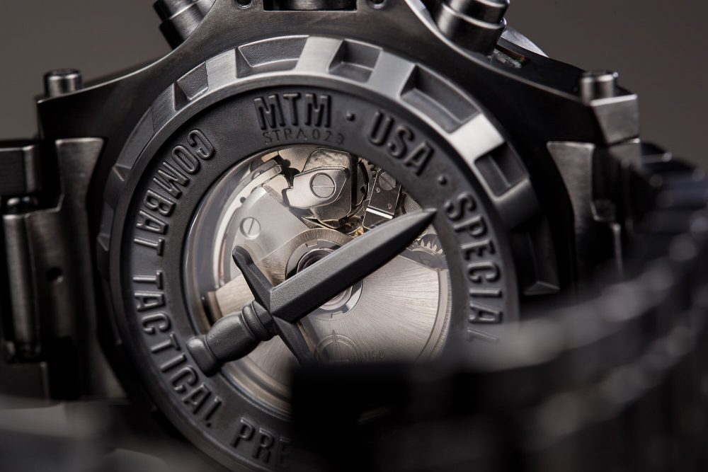 Awarded with a COSC certification for its Swiss Chronometer Day/Date Caliber ETA 7750 Movement, this is the first MTM watch to incorporate automatic movement. Painstakingly crafted and engineered, each design feature of the watch are strictly proprietary to MTM’s watchmaking abilities. With exceptional, rugged dependability, robustness, these Sherman 3-GER watches have reached a new milestone. Each watch case and bracelet is made from solid titanium and the watch case has carbon-fibre profiles, along with two sapphire crystals, including an exhibition glass case back with a stamped MTM dagger insignia.