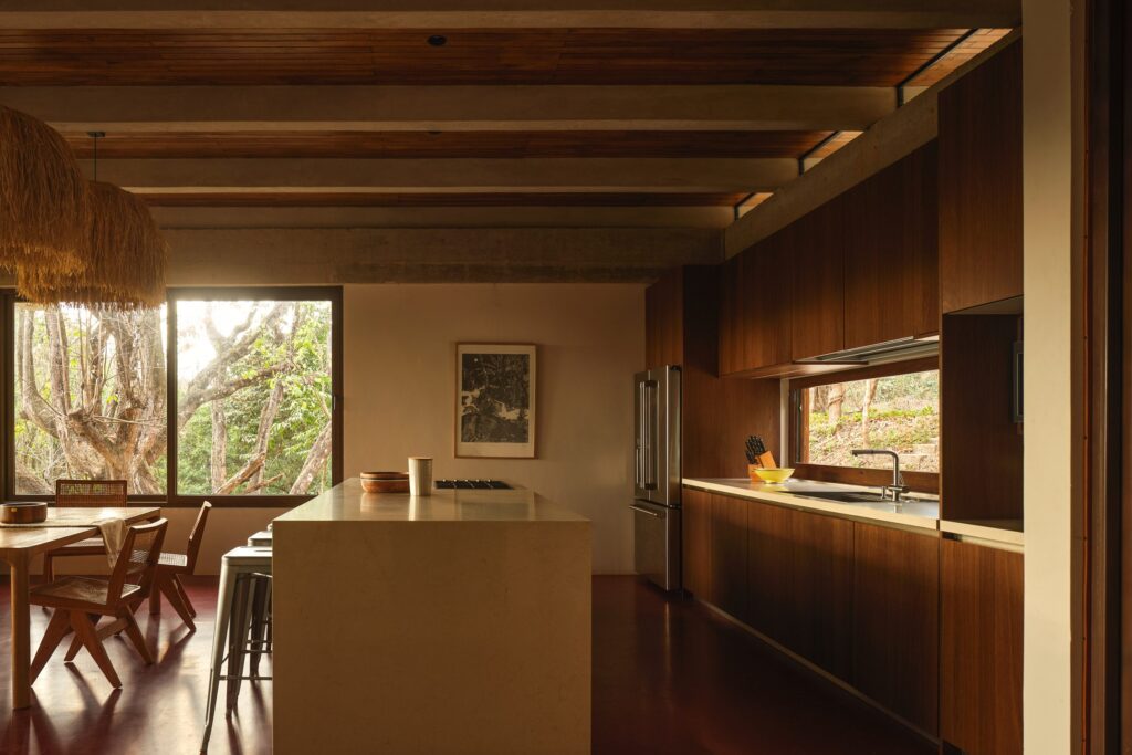 This commitment to a raw, durable aesthetic seamlessly transitions into the home’s interior spaces. Stunning teak wood carries effortlessly from the exterior soffits right across the indoor ceilings, continuously drawing the eye outward toward the jungle canopy.