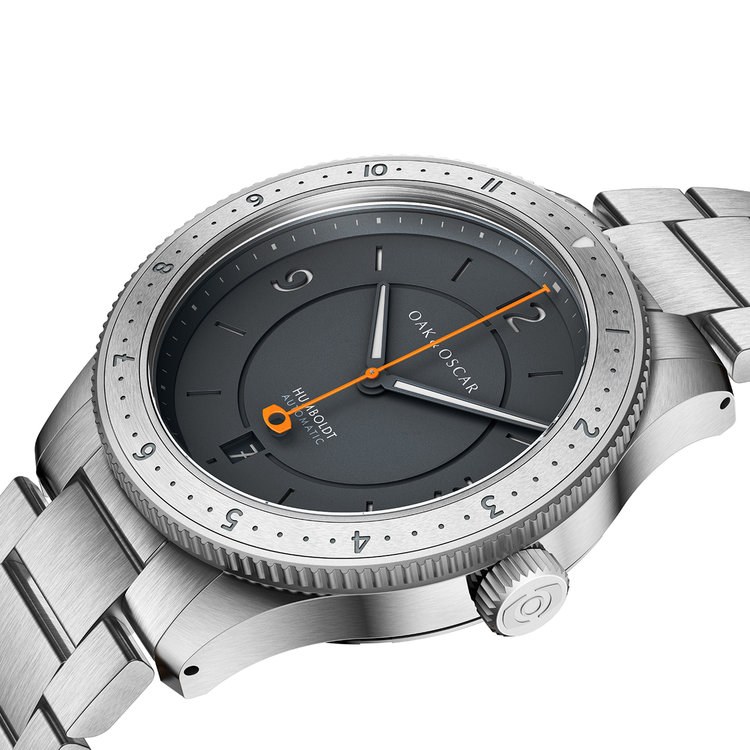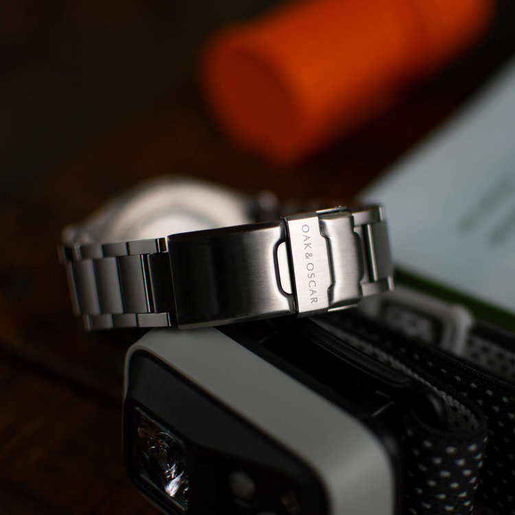 The biggest difference with this Oak & Oscar watch is that it is available with a steel bracelet. After some 18 months of research, prototyping, and testing, this represents the first Oak & Oscar bracelet. This eye-catching, stainless steel bracelet sits comfortably on the wrist with a fully articulated link design that gradually tapers from the 20mm solid end links to the 16mm buckle. It is ready to tackle the elements, and adds a striking aesthetic to the Humboldt watches.