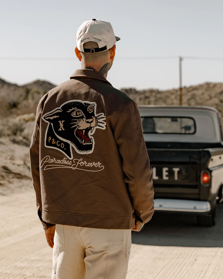 P & Co’s Paradise Forever Mechanic Jacket in brown is a regular-fit men’s jacket, made from a robust 100% cotton canvas. It boasts their ‘10 years panther’ patch on the reverse, utilitarian-style pockets and custom brass metalware.
