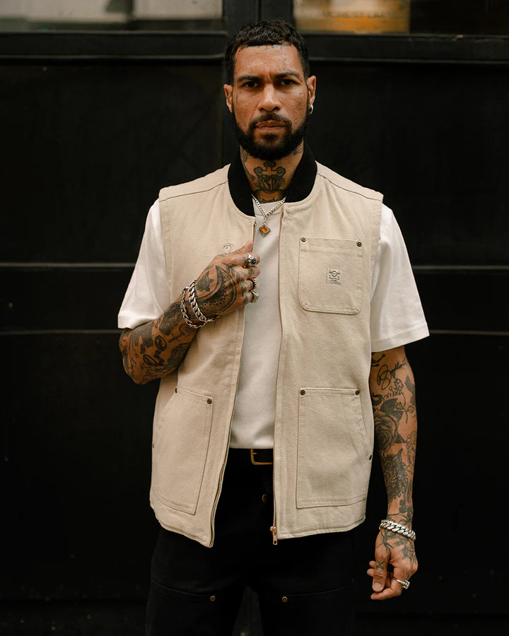 The Utah Vest Jacket in bone is a regular-fit vest jacket crafted from a no-nonsense 16oz duck canvas. It has a ribbed knit collar and diamond-quilted lining, it is the ideal transitional layering piece with nods to traditional workwear vests such as the pencil slot & nato clip