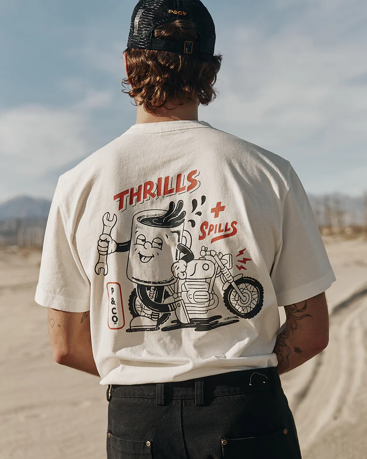 The Thrills & Spills T-shirt in Off-White from P & Co is a relaxed fit men’s graphic t-shirt made from a mid-weight 100% soft cotton slub jersey. The classic crewneck boasts hand-drawn artwork on the reverse & a small graphic print on the front.