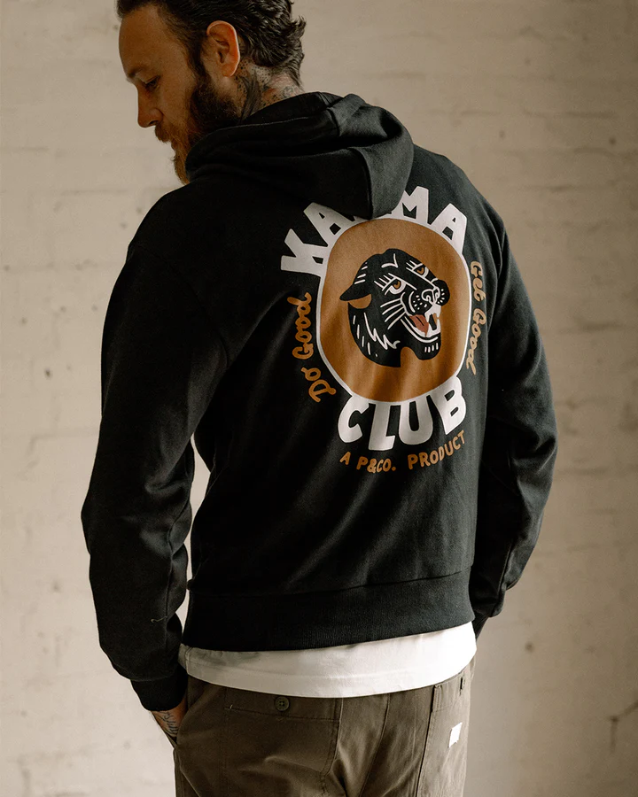 The P & Co Karma Club Hoodie is made from a mid-weight 420 GSM unbrushed French Terry material that makes for a strong yet comfortable piece- ideal for transitional layering. Inspired by vintage gym wear, it features a ribbed hem, cuffs and a drawstring hood.