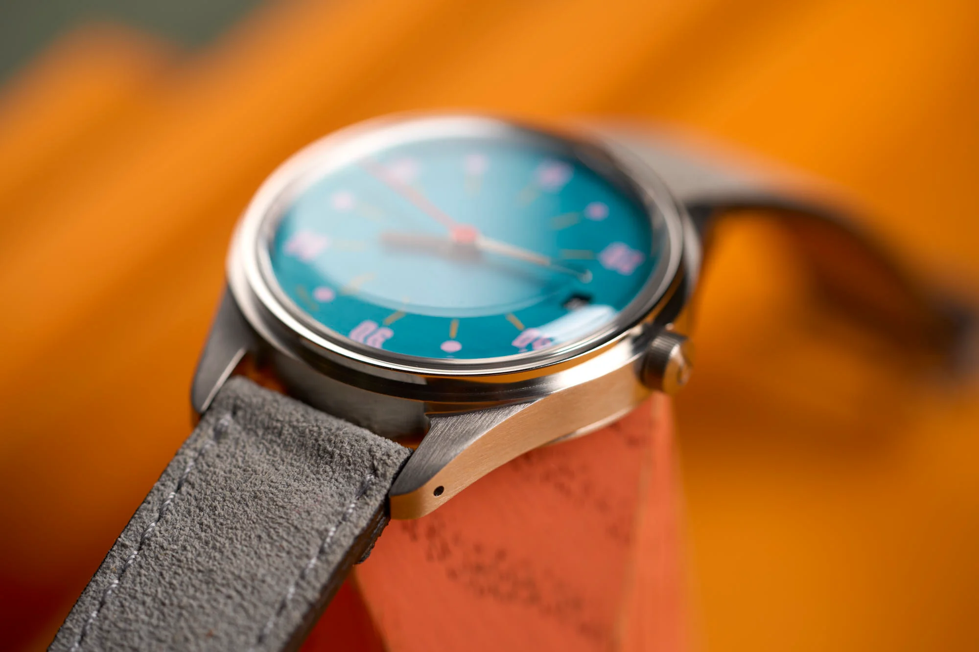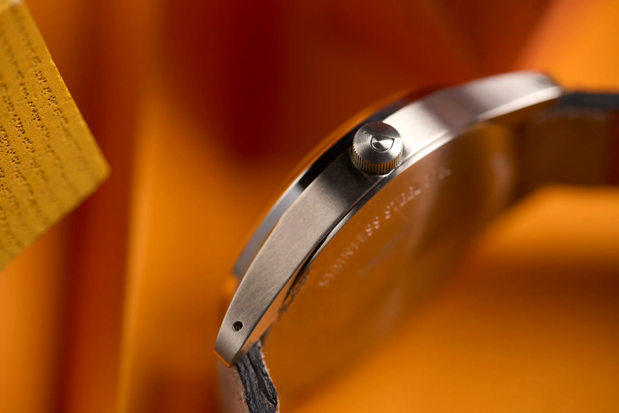 With a 38mm brushed stainless steel case that measures 11.6mm thick and boasts drilled lugs that accept a standard 18mm strap, this is a versatile timepiece. Sitting at the heart of the watch is a handmade anodized aluminium dial, which is manufactured in the UK and shows off a bespoke typeface that was developed in-house and informs the distinct design language of the centrally-mounted hands.