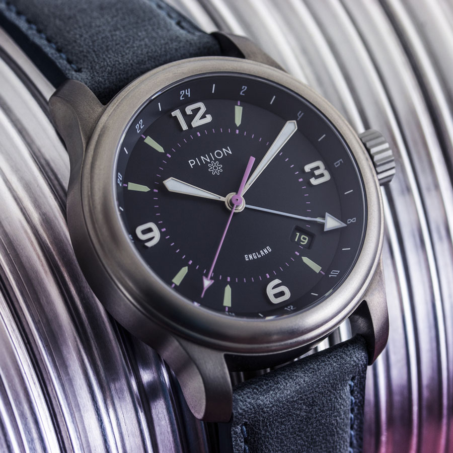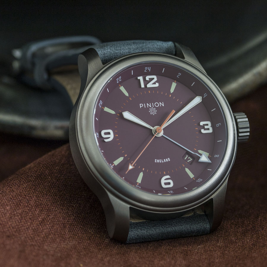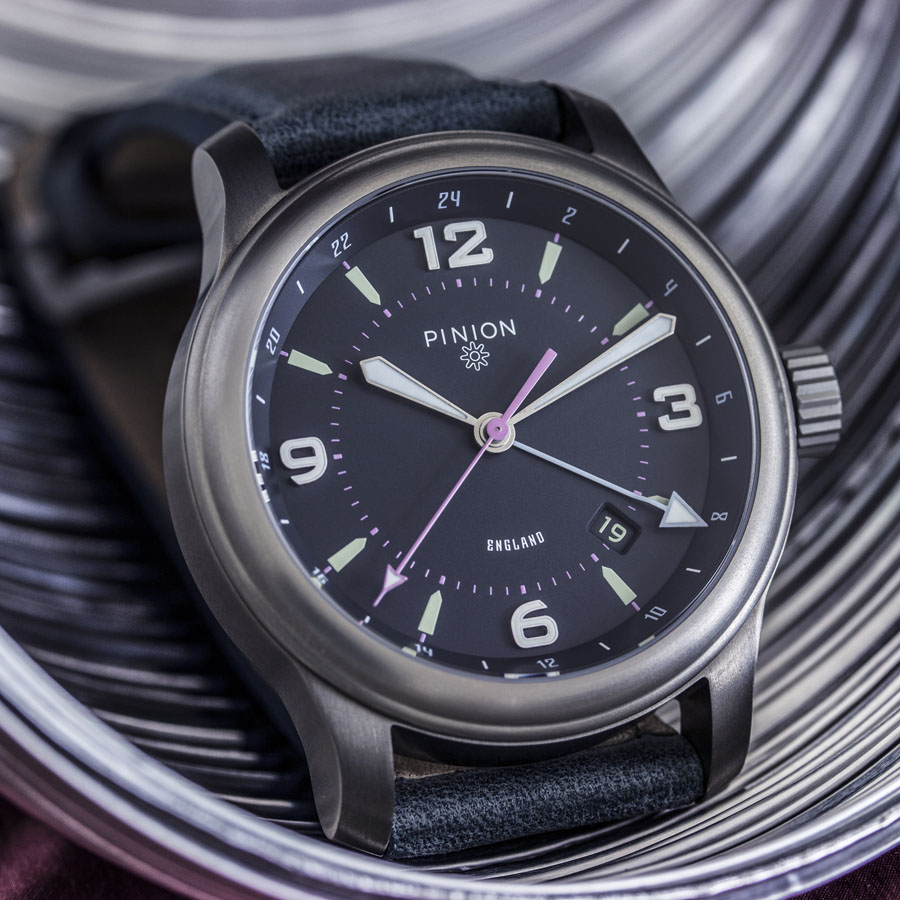 The Pinion TT Watch comes in two different versions with distinctly different dials so you can choose the one that best fits your own style tastes. The two dial variants are Maroon and Anthracite, with each titanium GMT watch boasting a contrasting colour scheme and central seconds hand. The TT is a 42mm titanium GMT watch with dual time-zone functionality and powered by a Swiss automatic movement.