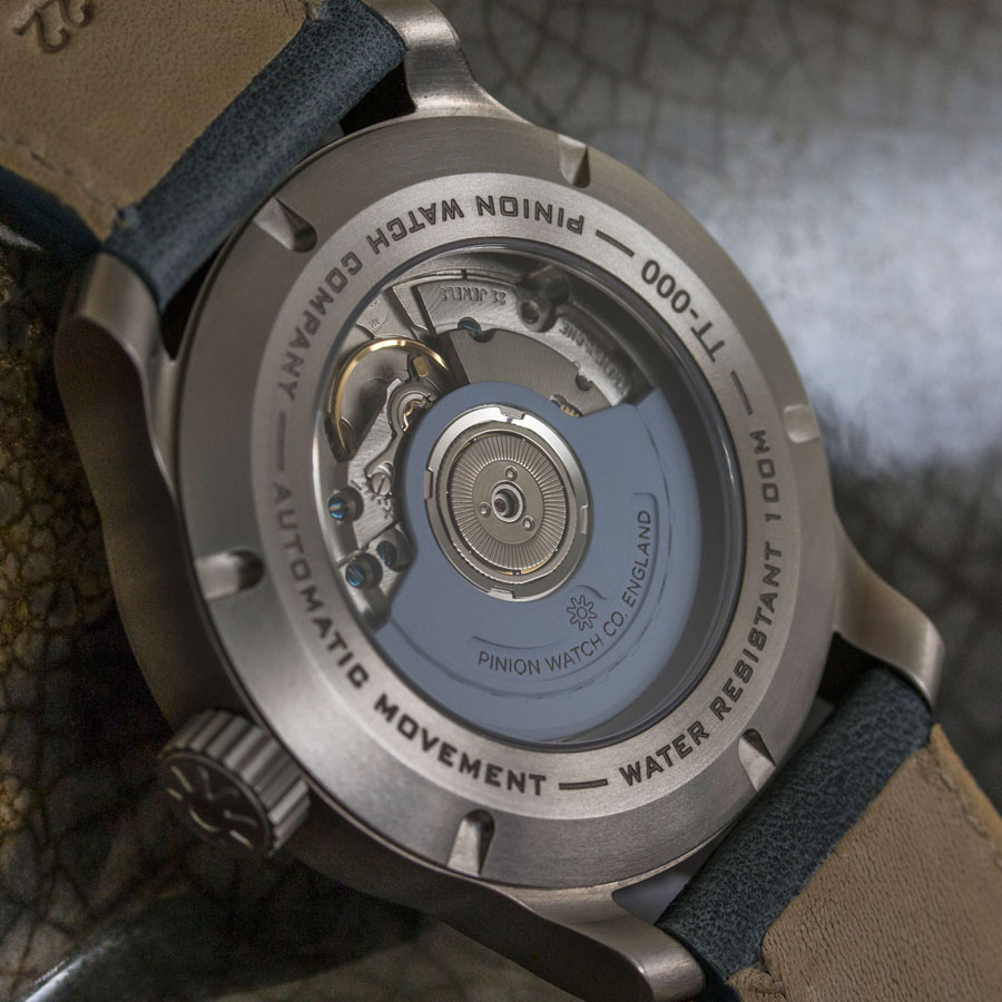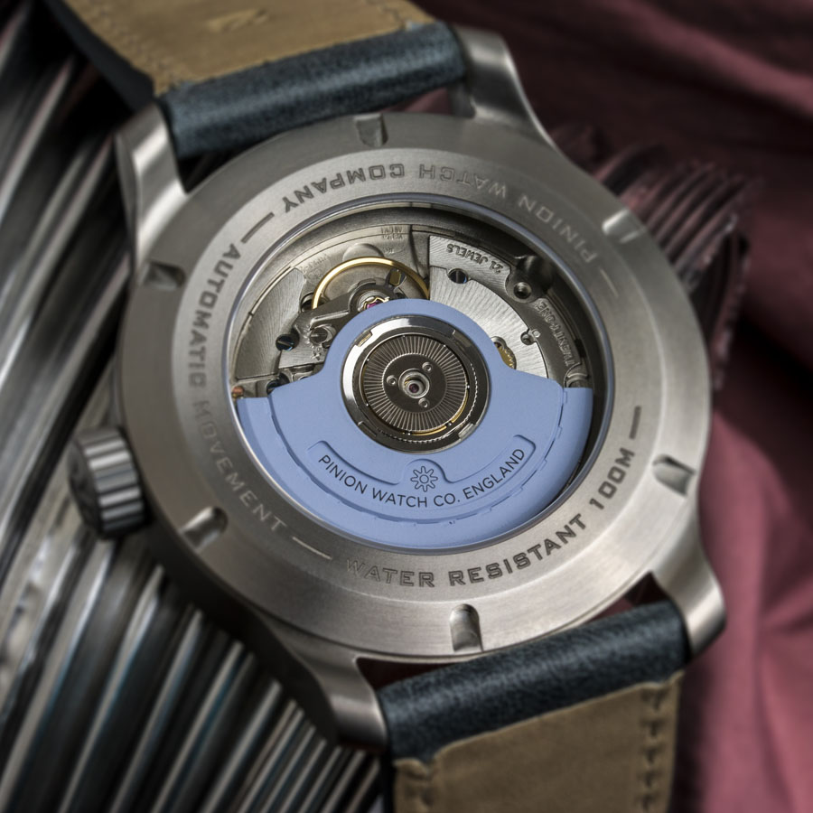 At the heart of the titanium GMT watch is a Swiss made automatic movement, namely, the ETA 2893-2 movement, which provides incredibly reliable and accurate timekeeping day in, day out. The decorated movement and Pinion beau-blue winding rotor can be seen through the glass exhibition case back on the reverse and this is a design feature that we always love to see on high end watches like the Pinion TT. As with all Pinion watches, the TT has a water resistance up to 100 metres in depth and it is finished, assembled and tested by experienced watchmakers in England.