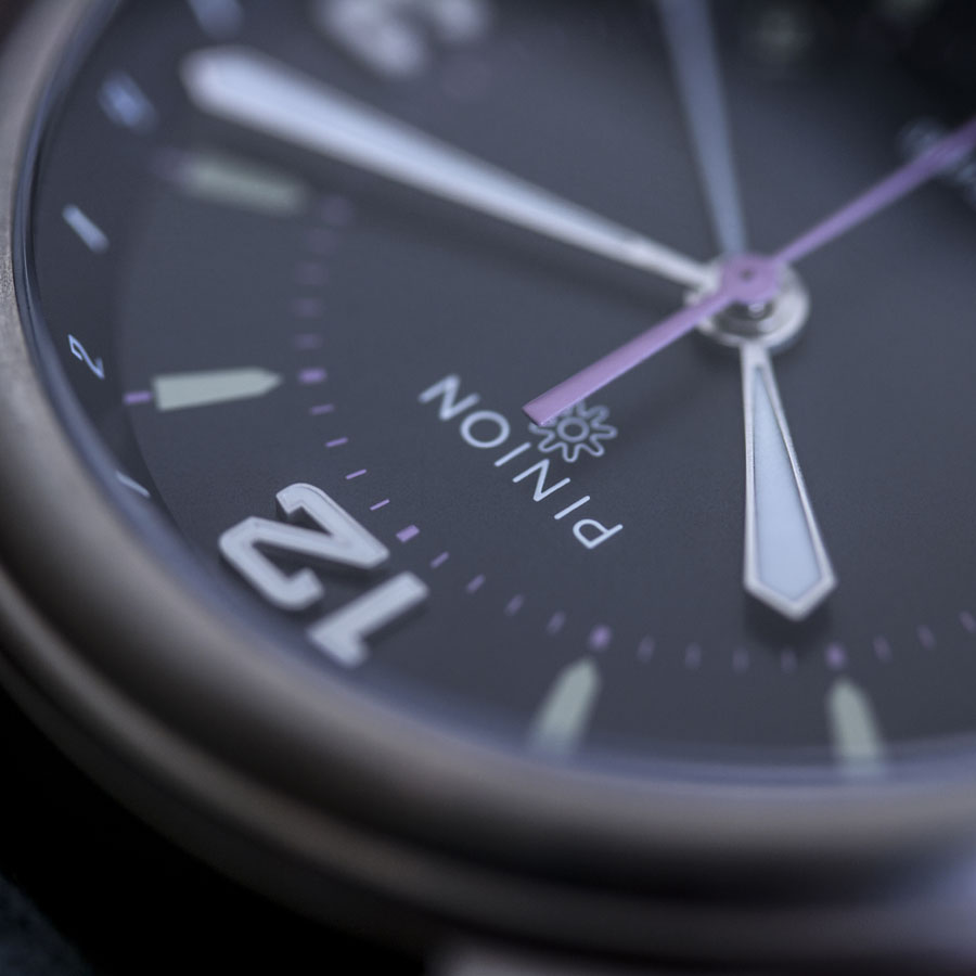 As with previous timepieces to be found in the Pinion collection, such as the Pure and R-1969, the Pinion TT Watches feature applied typographic numerals which are raised above the base of the dial for an attractive and striking visual impact that we’re loving here at Coolector HQ. As a result of this, the design of the 24 hour GMT hand features a curve to allow it to pass these numerals.