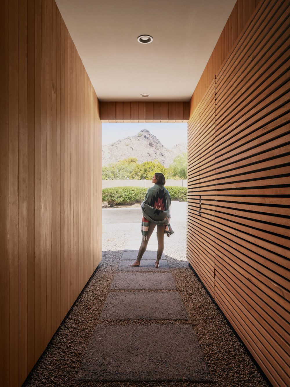 The Pleats House from The Ranch Mine boasts an understated, recessed entryway, which have been included due to its likeness to the holes at the base of the cacti where animals live. The property has a hidden door to the guest suite, along with the front door into the home which is a pretty cool little design feature in our opinion here at The Coolector. As the budget was tight, in order to keep costs down, the homeowners reused the foundation of the original structure and designed the bedrooms, including a master suite. A new volume was added featuring high ceilings, mountain views, and an indoor/outdoor connection.