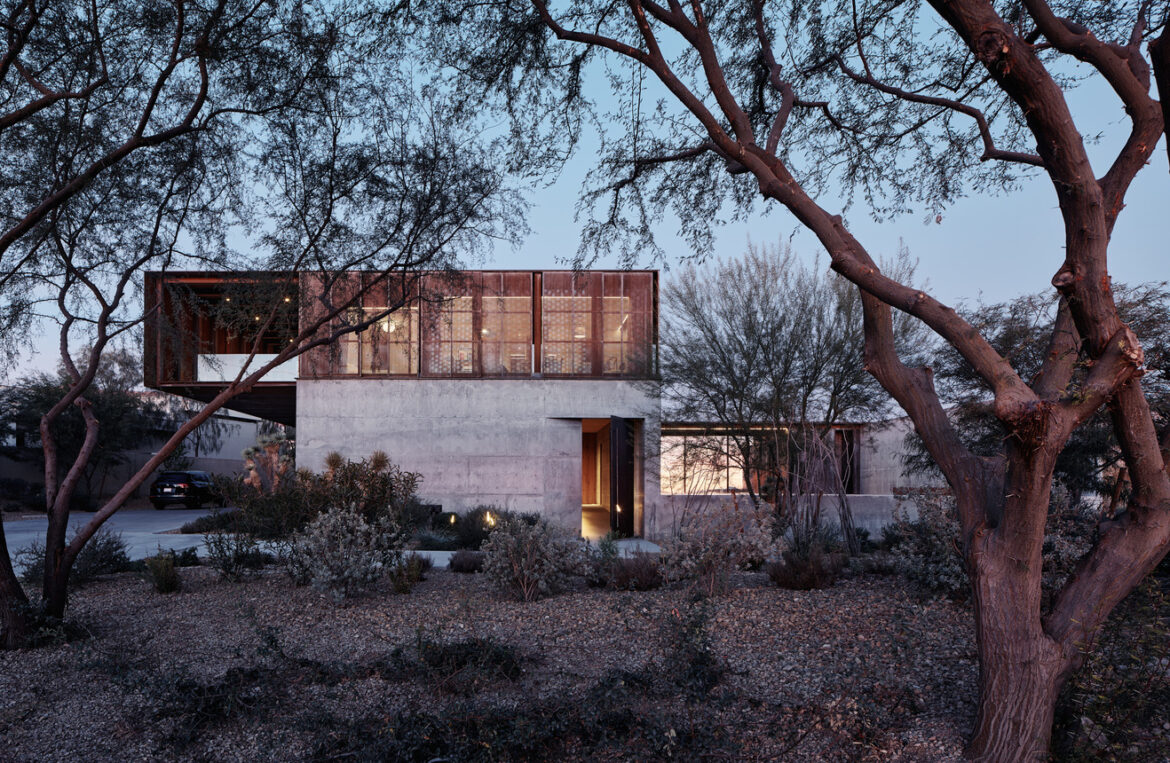 At the upper level, the house features sleeping rooms enclosed in a screened framework clad in perforated weathering steel. These elongated spaces run along the east-west axis, offering protection for the pool from both wind and sun. Extending from the south side is a shaded deck screened with perforated mesh, which cantilevers over the structure below to shield both the home and the cars parked beneath it. The result is a visually striking interplay of form and function—open to the Red Rock Canyon to the west and the shimmering city lights to the east, the cantilevered sections balance out the sculptural weight of the basin and water.
