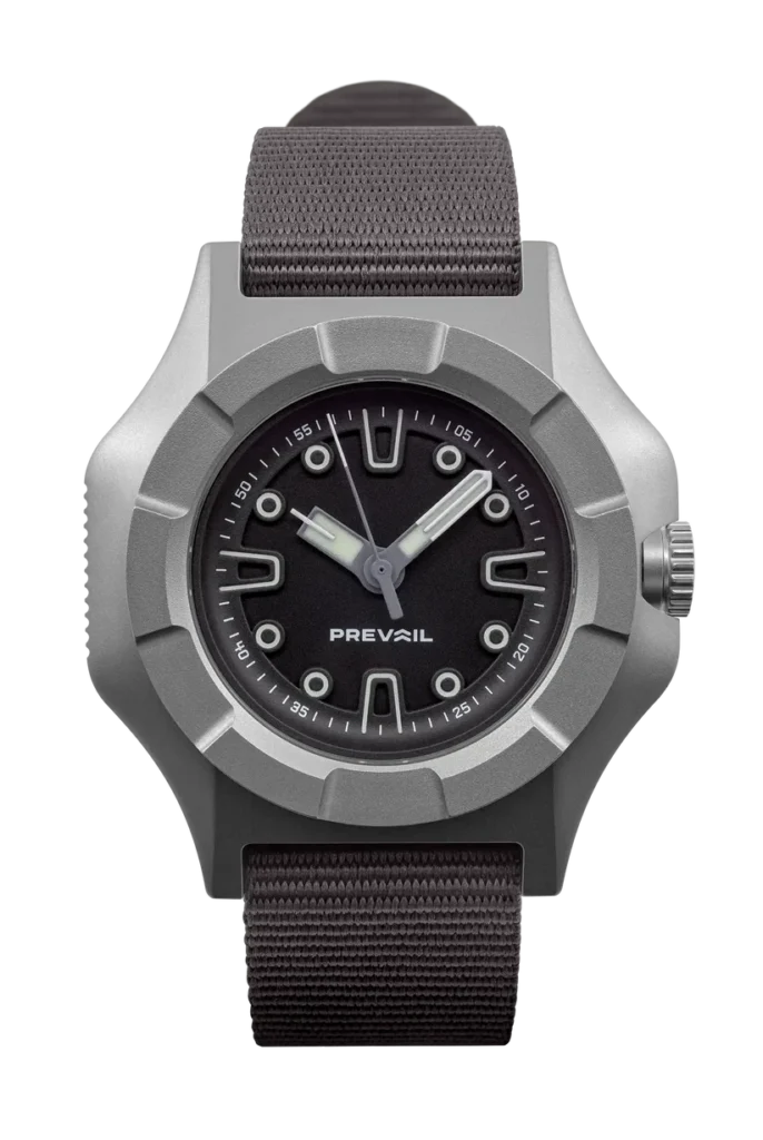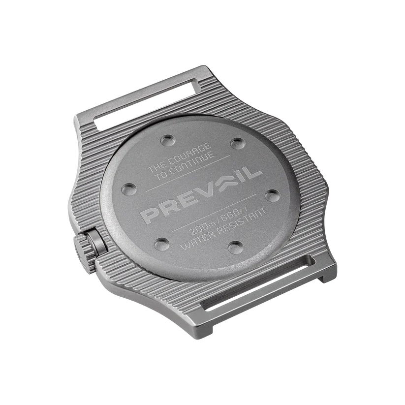 It features a wonderfully stealthy, matte stainless steel case that is built like an absolute tank. To ensure it can withstand the harshest environments imaginable, Prevail has engineered the case with incredibly robust fixed lugs—meaning there are no flimsy spring bars to snap during a rigorous hike or climb.