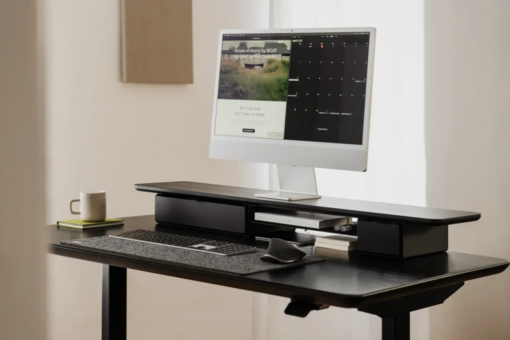 The 105cm length provides ample real estate for even the most expansive ultrawide monitors, supporting up to 100kg without a hint of flex thanks to the sturdy powder-coated steel legs. It feels permanent, tactile, and incredibly grounded—a “forever” piece for your office rather than a temporary fix.