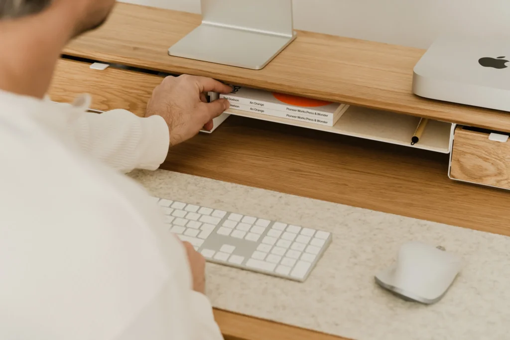 Functionality is where the “Pro” moniker really earns its keep. The shelf features a clever modular drawer system that allows you to hide the daily detritus—pens, charging cables, sticky notes—that usually litters the desktop.