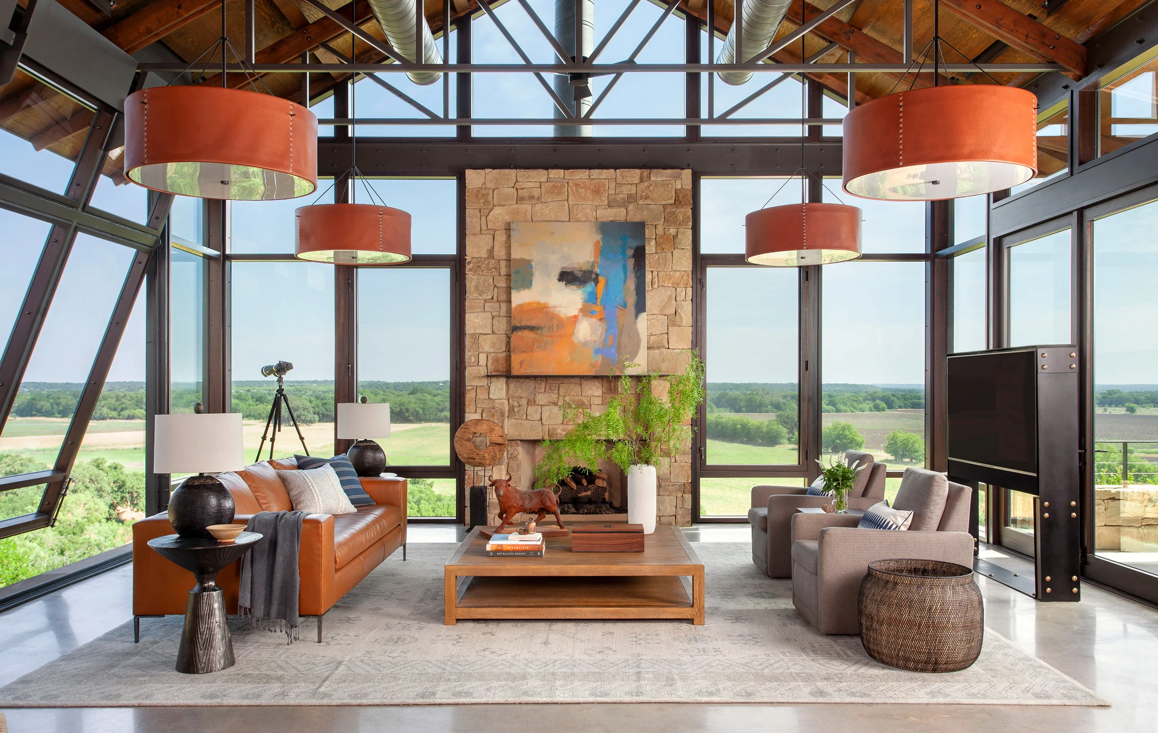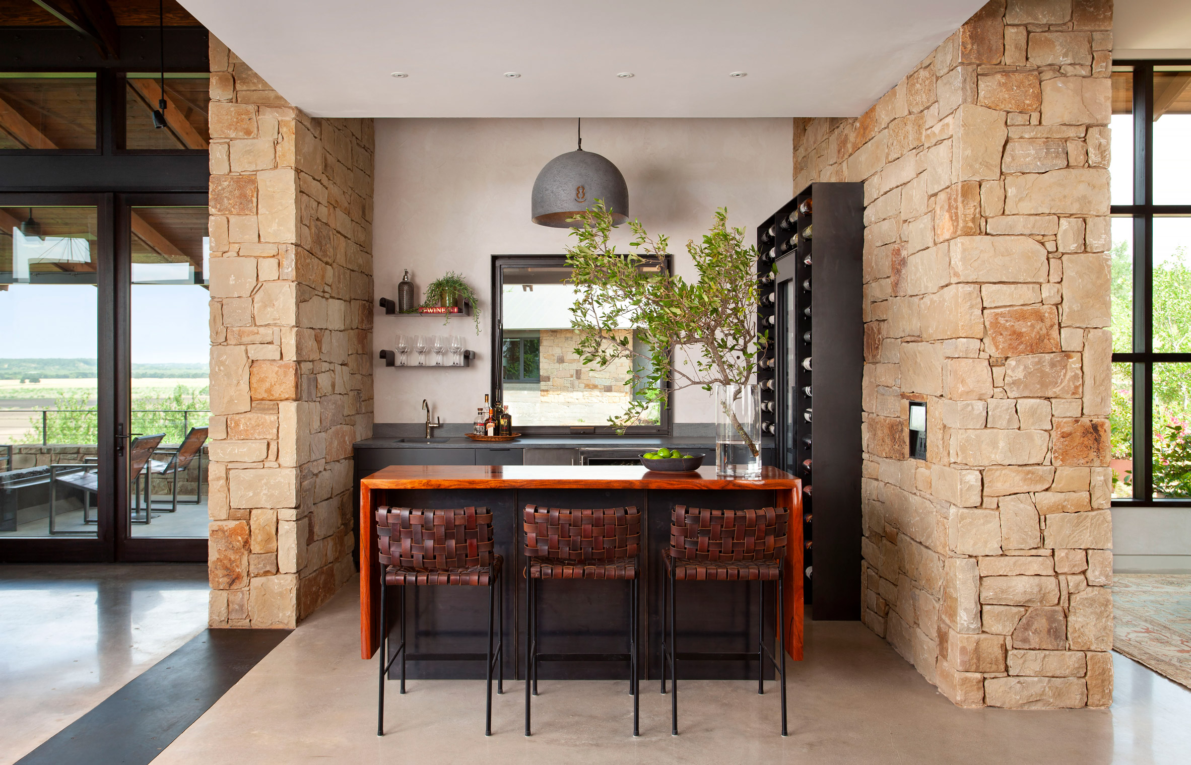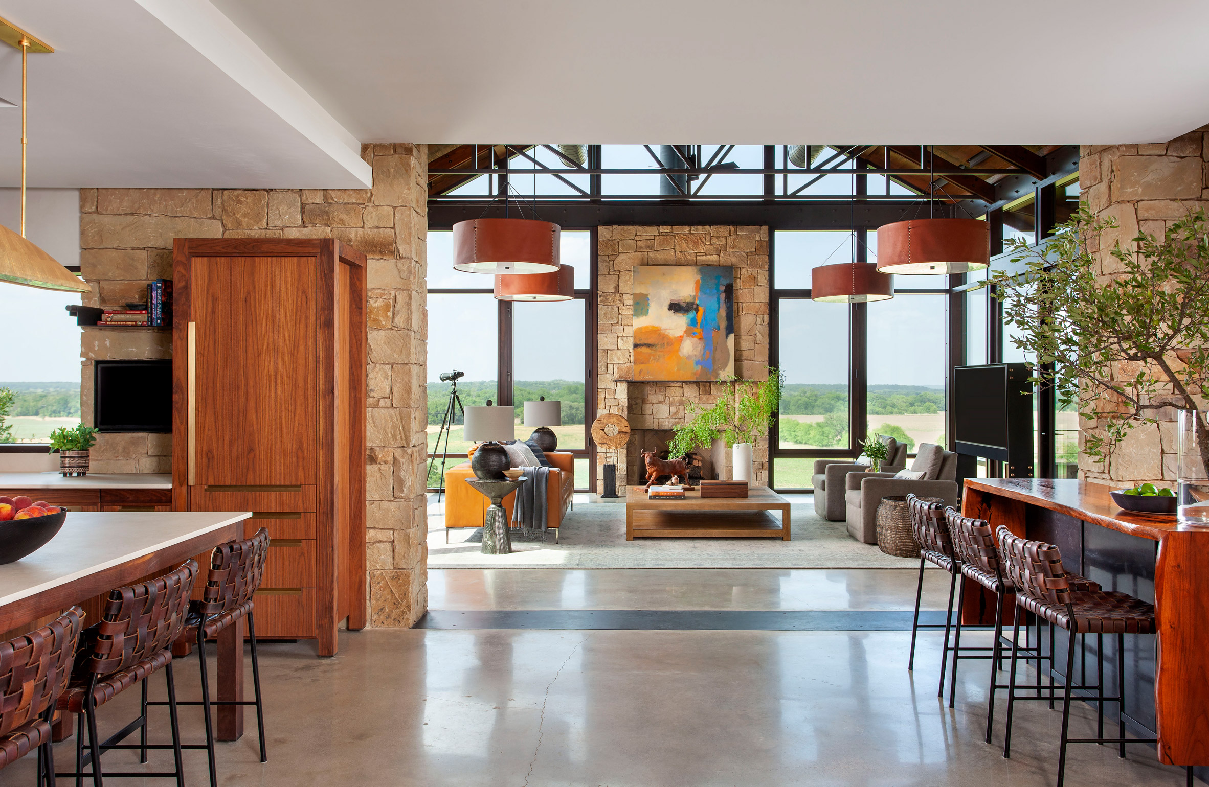 In addition to an expansive 2,700-square-foot building where the owners live, there is a also guesthouse with two extra bedrooms, a garage that is connected to the home by a covered driveway and a spectacular swimming pool. Visitors make their way into the home via a central hall that leads to the various communal rooms, and this includes the living room, kitchen, bar and formal dining room. The living room of this majestic Texan home is set apart from the kitchen and bar area and boasts eye-catching glass walls on three sides and tall wooden ceilings supported by exposed steel trusses. A magnificent piece of modern design.