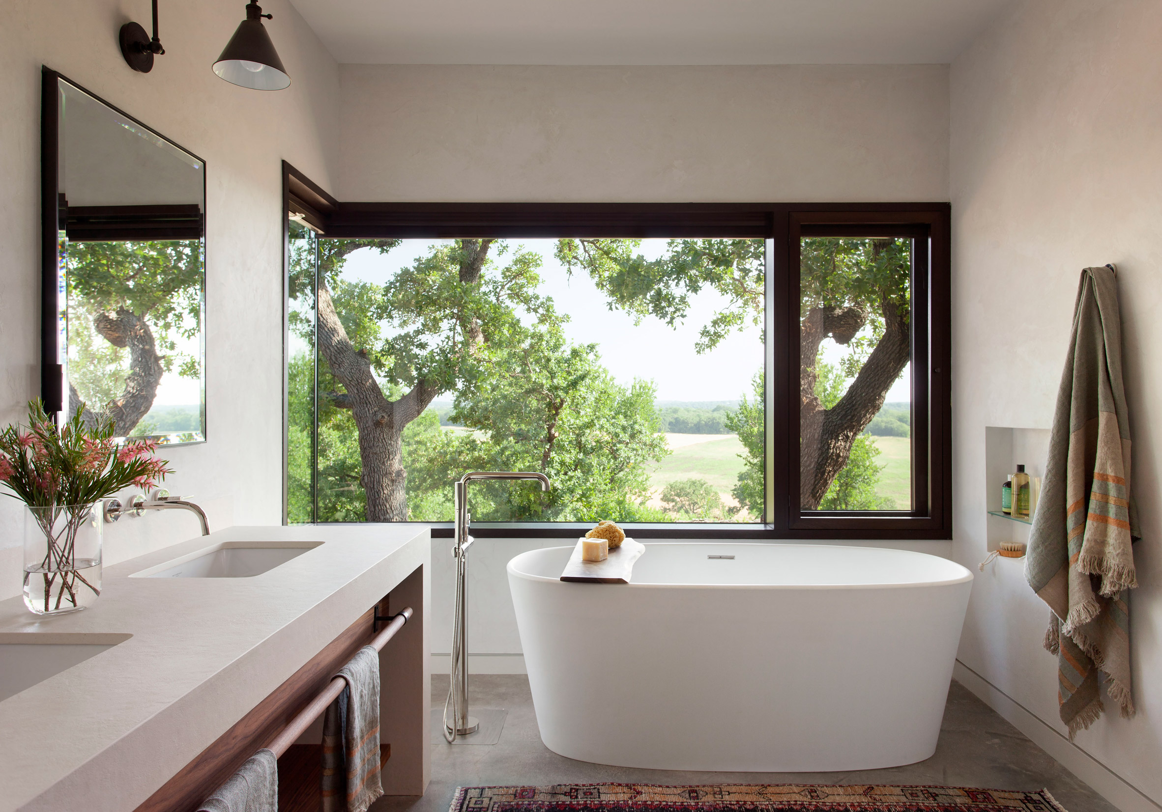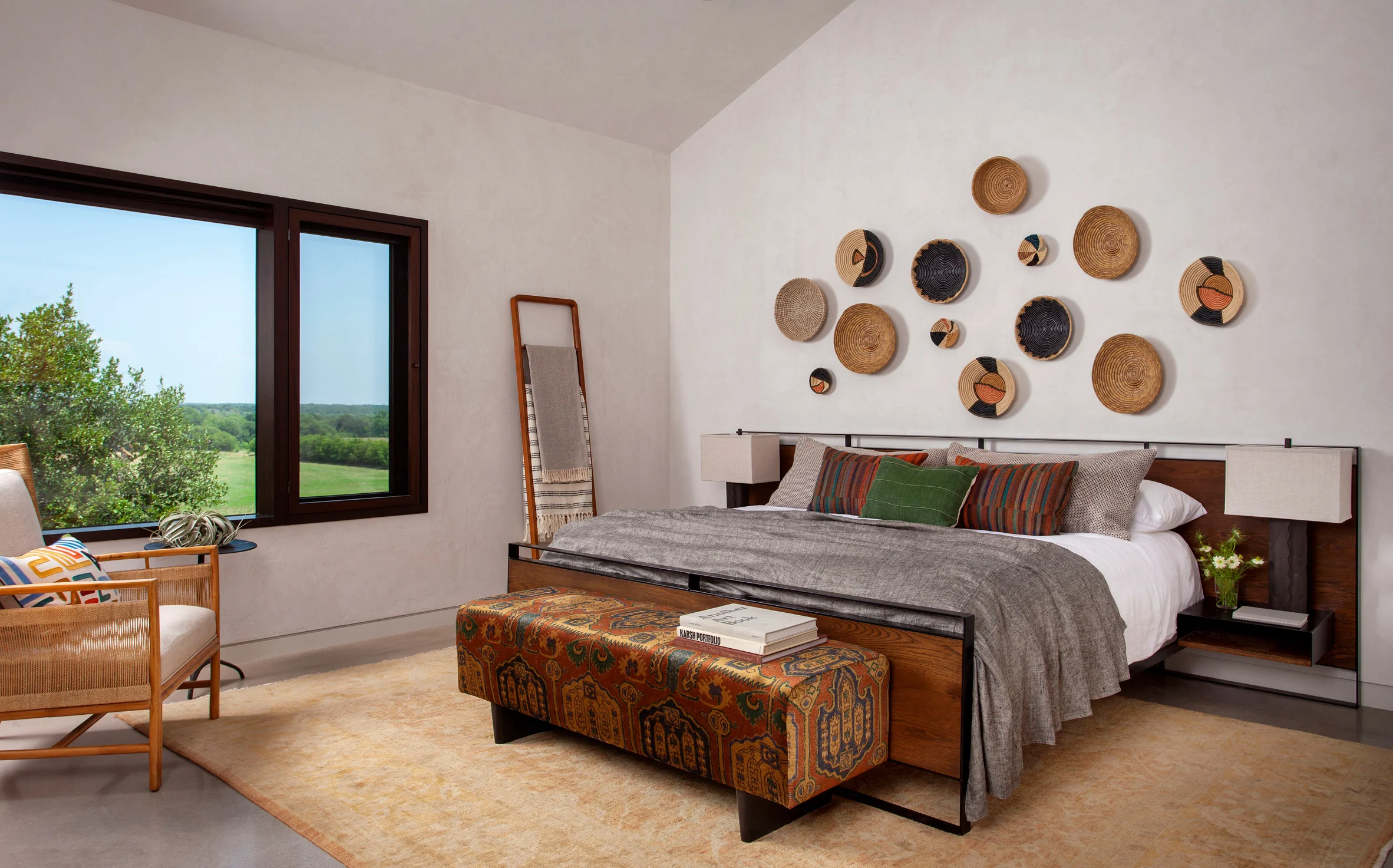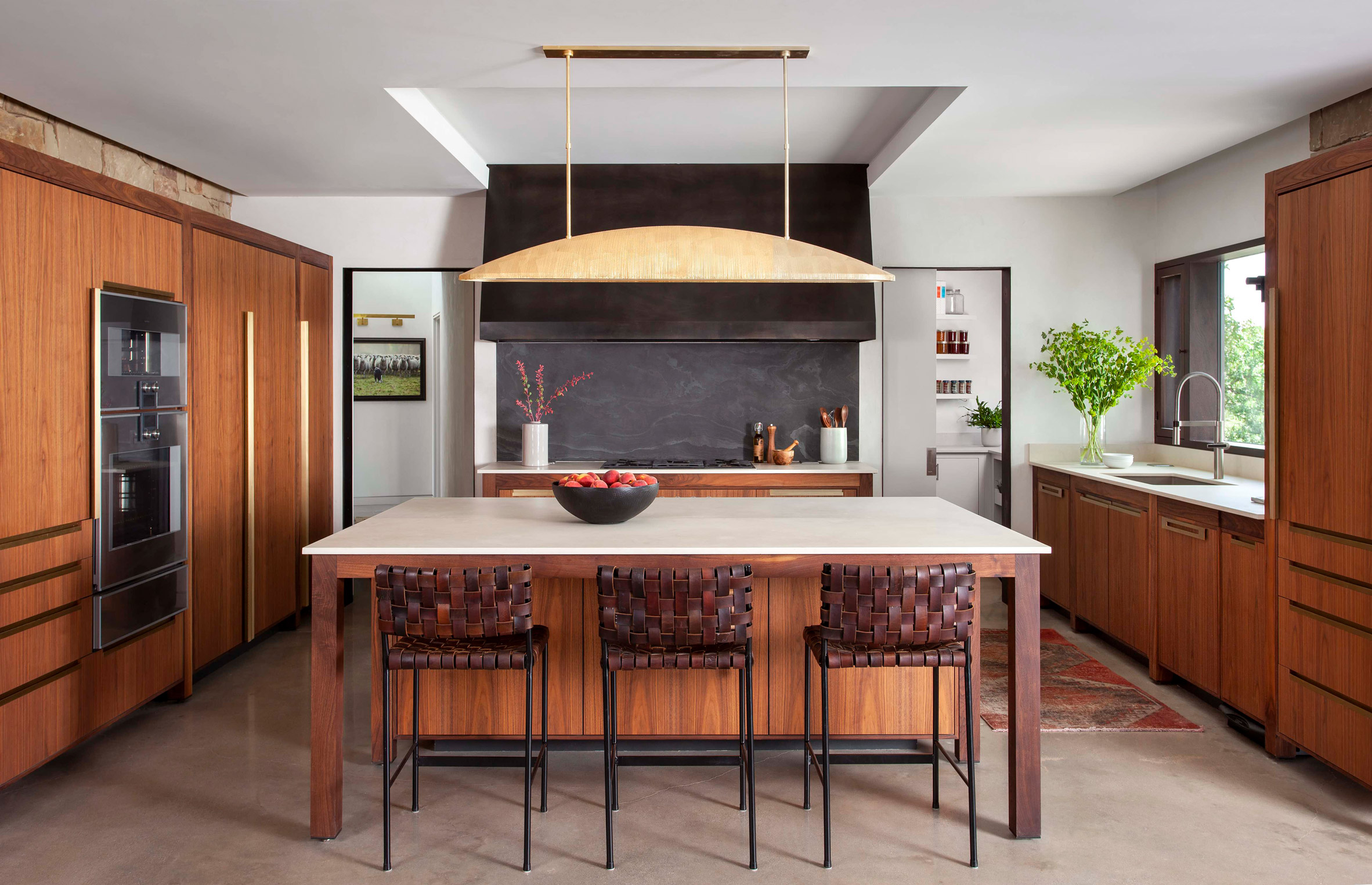 In addition to an expansive 2,700-square-foot building where the owners live, there is a also guesthouse with two extra bedrooms, a garage that is connected to the home by a covered driveway and a spectacular swimming pool. Visitors make their way into the home via a central hall that leads to the various communal rooms, and this includes the living room, kitchen, bar and formal dining room. The living room of this majestic Texan home is set apart from the kitchen and bar area and boasts eye-catching glass walls on three sides and tall wooden ceilings supported by exposed steel trusses. A magnificent piece of modern design.