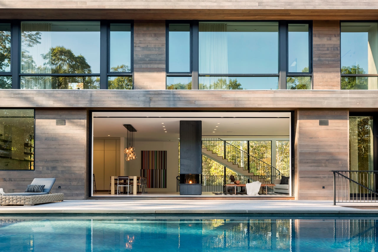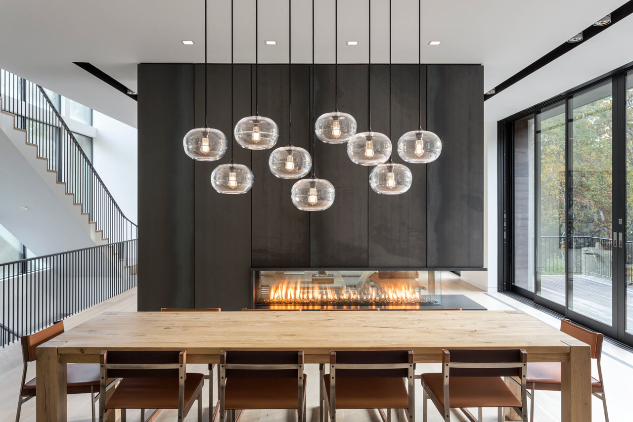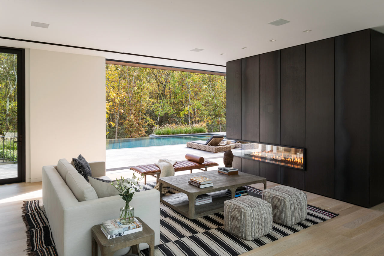 For those with a penchant for swimming, the Old Sag Harbor Road Residence from Blaze Makoid Architecture is definitely going to appeal. It has a negative edge swimming pool which is just steps from the main living area, and is connected by floor-to-ceiling sliding glass doors that disappear into the fabric of the building. This opening measures some 22.5ft so really does bring the outdoors inside and strikes the perfect balance of indoor / outdoor living. Within the main living space there is a three-sided fireplace which has been clad in blackened steel and provides a divide between the living room and dining room.