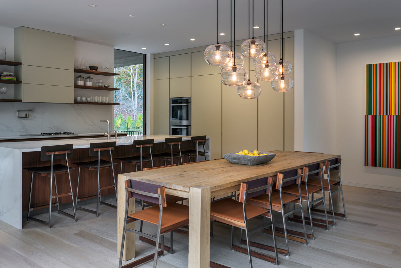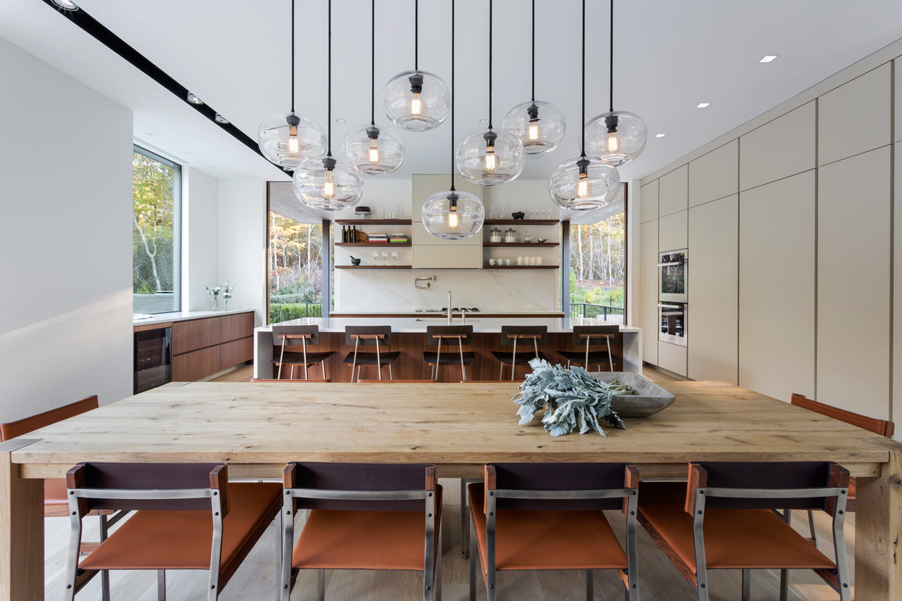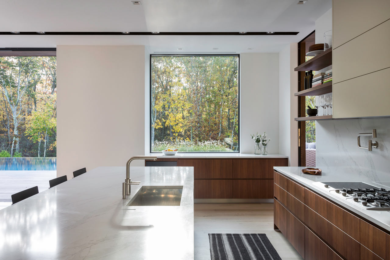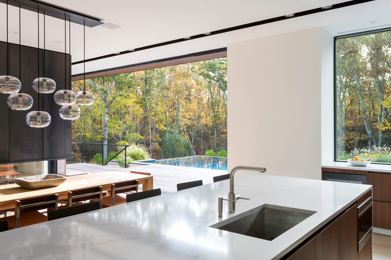 For those with a penchant for swimming, the Old Sag Harbor Road Residence from Blaze Makoid Architecture is definitely going to appeal. It has a negative edge swimming pool which is just steps from the main living area, and is connected by floor-to-ceiling sliding glass doors that disappear into the fabric of the building. This opening measures some 22.5ft so really does bring the outdoors inside and strikes the perfect balance of indoor / outdoor living. Within the main living space there is a three-sided fireplace which has been clad in blackened steel and provides a divide between the living room and dining room.