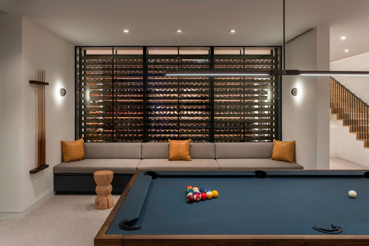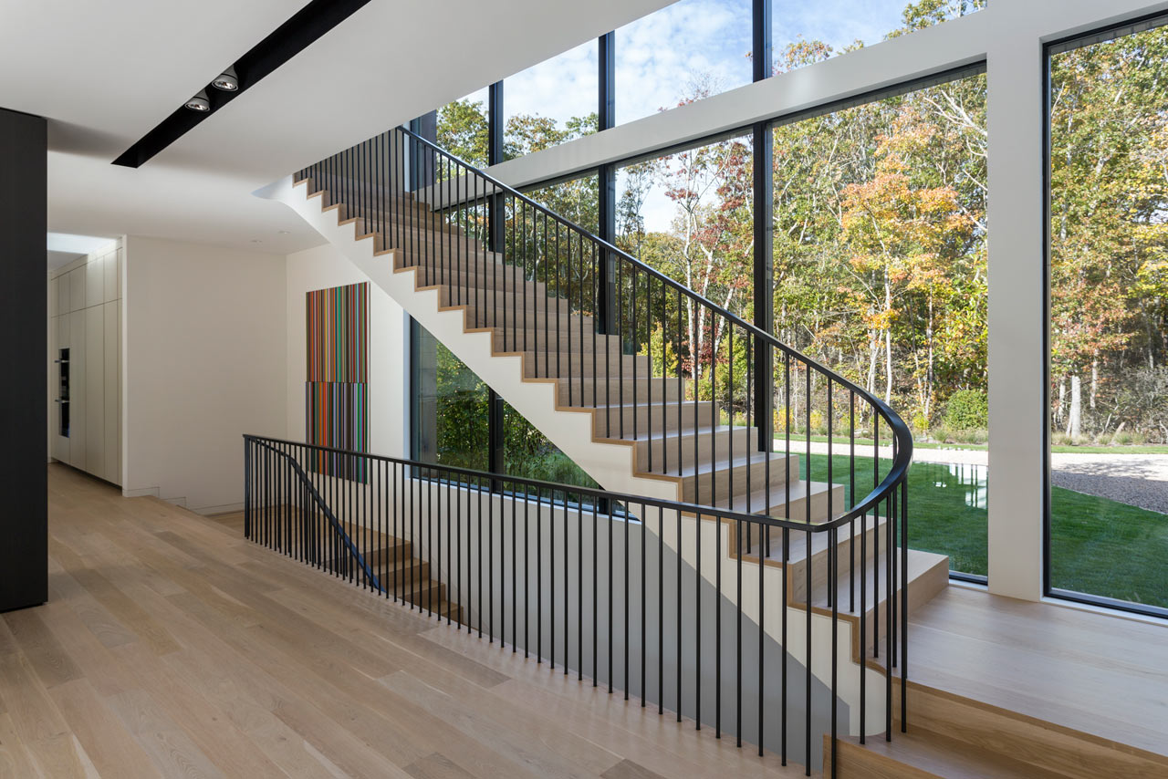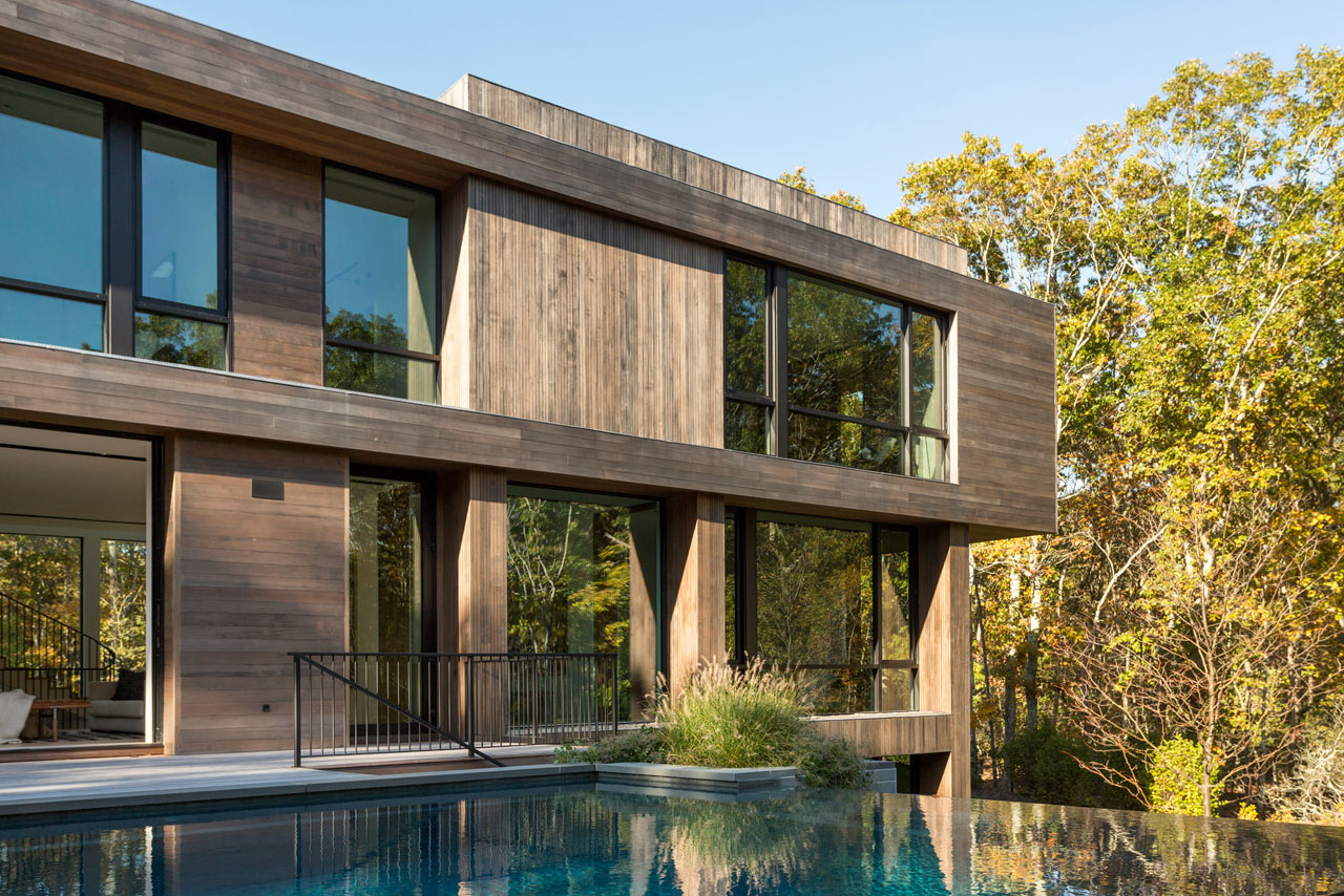 Perched atop a wooded lot the objective of the Old Sag Harbor Road Residence is to deliver seamless indoor/outdoor living and, as you can see from these excellent images, it’s mission well and truly accomplished. Measuring a rather vast 7,100-square-feet of living space, the home has actually benefited from the uneven topography of the plot, which has let the architects design a lower floor with a walk-out. The top floor then cantilevers out on either end of the linear home which adds a convertible amount of extra square footage without actually increasing the footprint of the build.