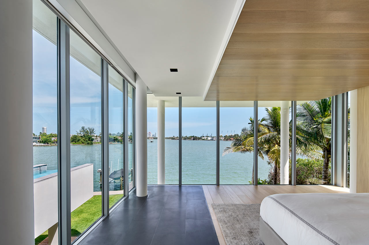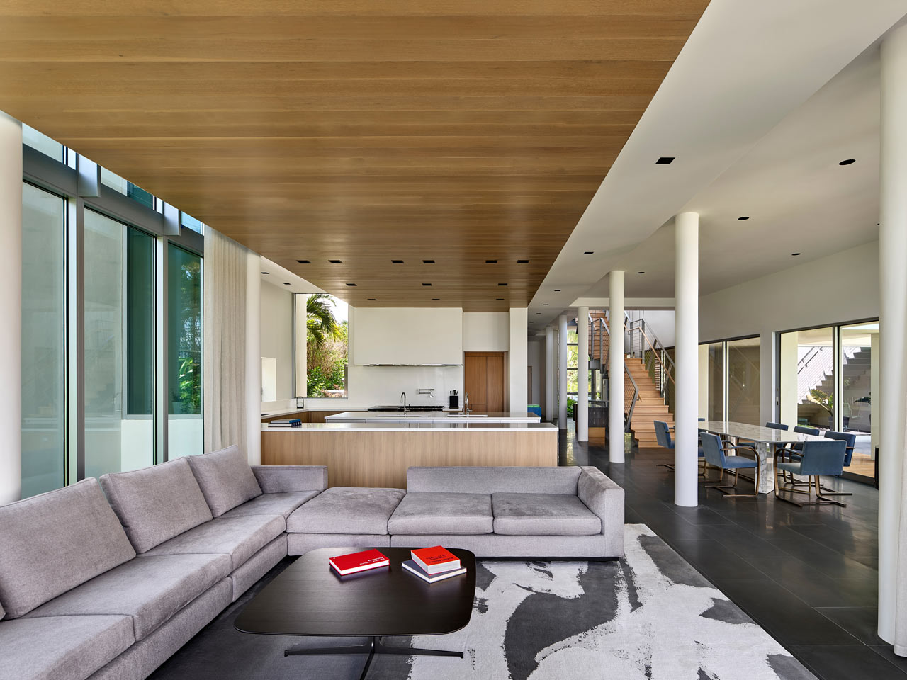 With the main element of the house, where you’ll find the living and sleeping areas, the architects have managed to keep it cool with floor-to-ceiling glass doors that open up to let the ocean breezes pass through. There is a large roof which overhangs and helps to keep direct sunlight to a minimum so it doesn’t get too hot during the balmy summer months. This is all cleverly designed so as to make the most of the weather conditions all year round in Miami.