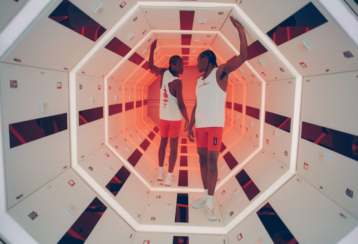 The colour palette chosen for the capsule further enhances its distinctive character. A soft, neutral foundation of clean whites and luminescent creams evokes a sense of understated elegance, providing a sophisticated backdrop for the collection’s bolder accents. High-contrast black elements are strategically incorporated throughout the apparel, adding a dynamic, fast-paced feel that speaks to the energy of the run. Disruptive pops of petal red inject an energetic shift, creating a visual contrast against the otherwise neutral tones and adding a vibrant focal point to key pieces. The capsule’s signature graphic, a bold red gradient eclipse, serves as a powerful symbol of constant evolution and transformation, a core theme that resonates throughout both the design and the underlying spirit of this unique collaboration.
