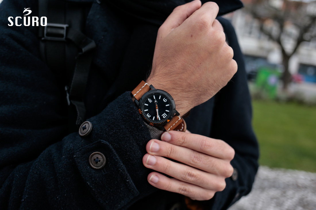 The SCURO Dive Watches boast a genuine leather strap and an equally as attractive NATO strap along with a Japanese Miyota 9015 Automatic Movement, 200m water resistance and a hard wearing titanium casing that will withstand everything that the deep blue sea can throw at it. Check out a few more shots below: