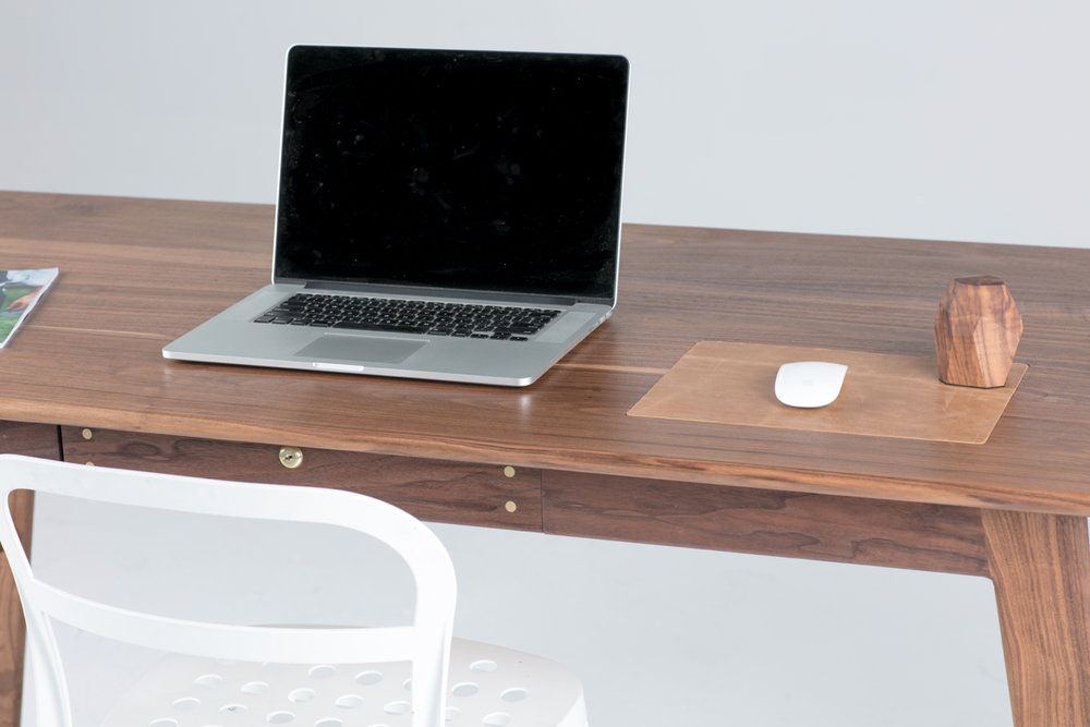 The Woolsey Wolf Desk has drawer slides which are made from brass for a sleek aesthetic, as well as brass pins on the front of the drawer which match the lock. This lets you store and lock your valuables and other essentials away in the drawer with ease. Each desk comes with the workshop’s signature built-in leather mouse pad that only can open with a strong magnetic wood geode (which is also provided), and allows for optimal storage for writing instruments, notepads, and mouse.