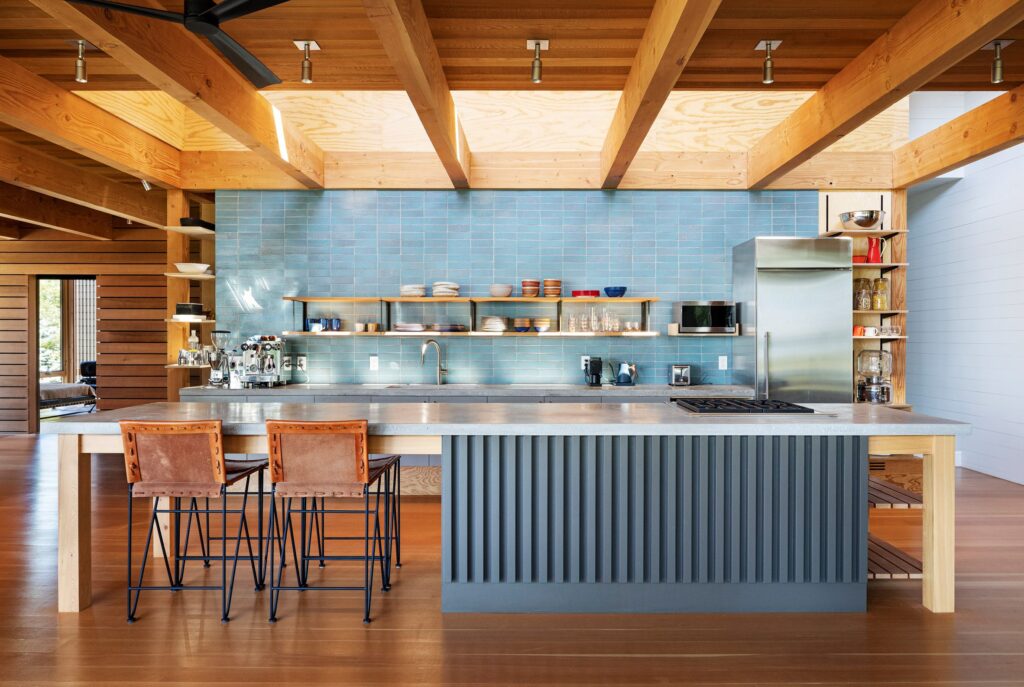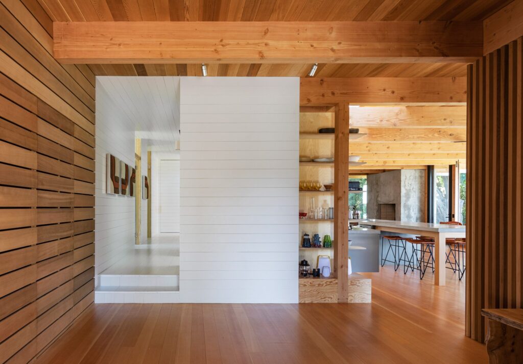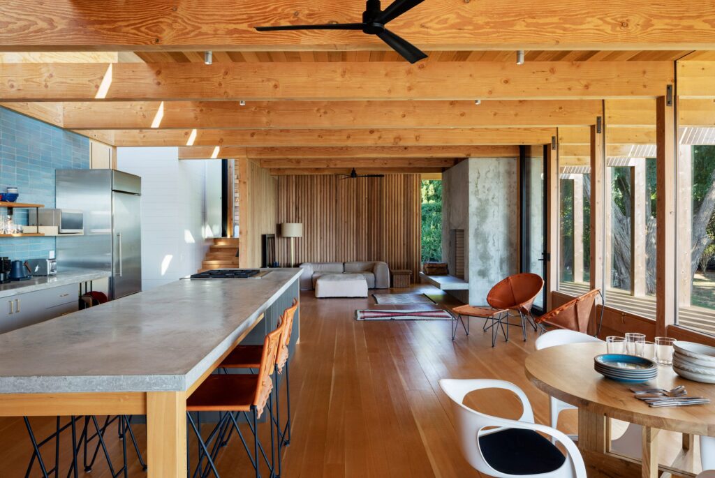 Inside the beautiful home, there is a clear division between public and private areas. The communal space occupies the lower portion of the house, while the sleeping zone is found in the taller volume. The interior features ample use of wood, including cedar wall slats and Douglas fir structural beams and columns. The kitchen is equipped with a glazed-brick backsplash, birch plywood cabinetry and concrete countertops. A clerestory brings in soft daylight.