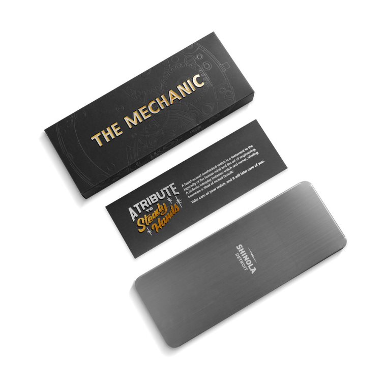 The hand-wound Swiss-made SW210-1 movement of The Mechanic accurately keeps the hours, minutes, and seconds. It should be manually wound habitually in order to restore the power reserve, which keeps the watch ticking. The Mechanic has an impressive minimum power reserve of 42 hours and the packaging has custom art created by Detroit’s very own Motown Sign Co. This beautiful box opens to reveal a custom metal watch box reminiscent of the boxes sign painters keep their brushes in.
