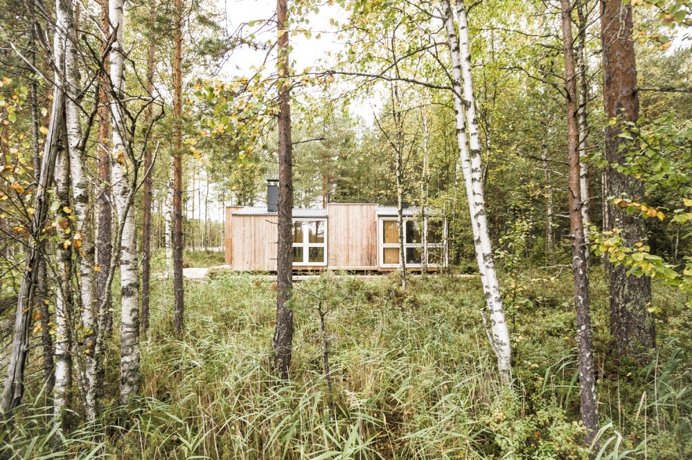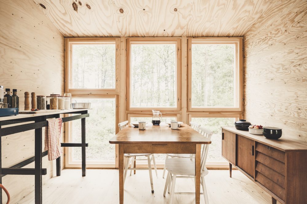 With a a modular frame, there is a degree of versatility to the design of the Small But Fine Cabin and Studio Politaire installed 17 squared lumber frames in total. Plywood boards add rigidity, and they are connected to each other with other wood to deliver a structure that looks very in keeping with its woodland surroundings. Wood was chosen as the dominant material for the cabin because it is sustainable, locally produced, cheap, easy to work with, long-lasting, climate-neutral, forgiving, reusable and produces a pleasant living-comfort.