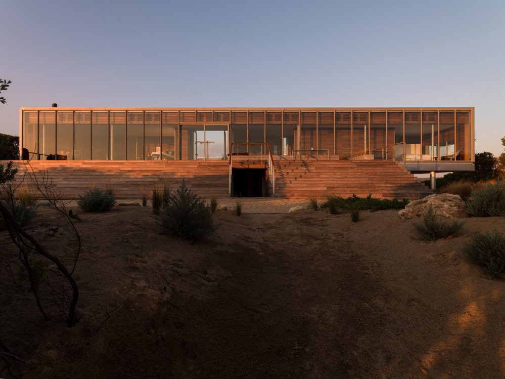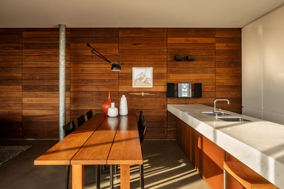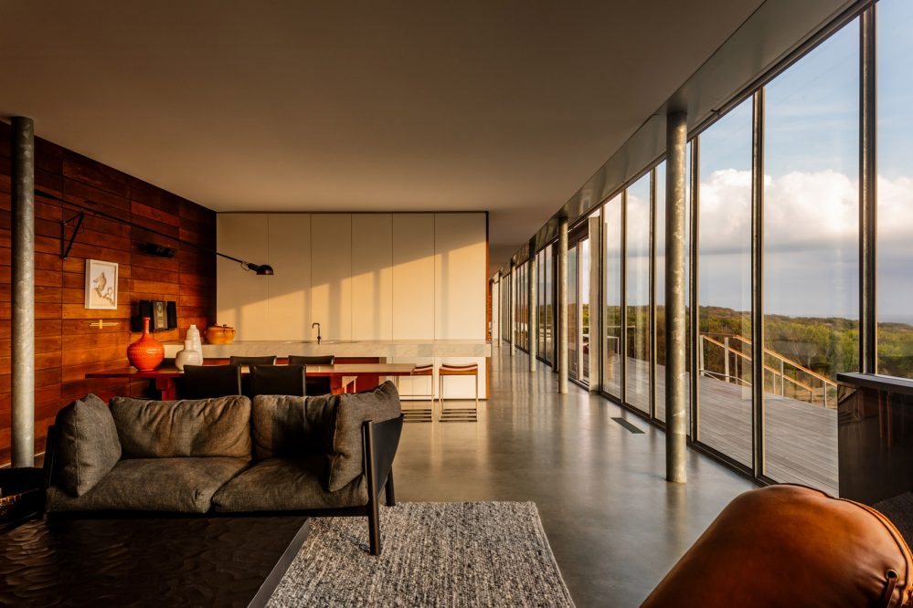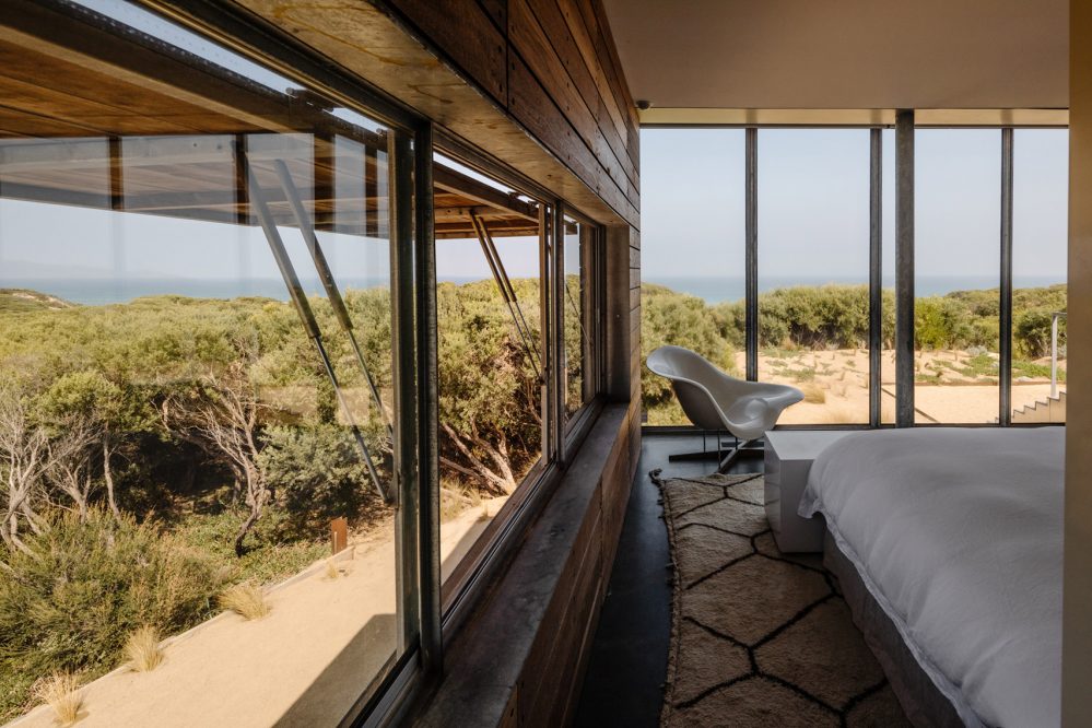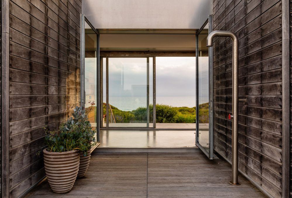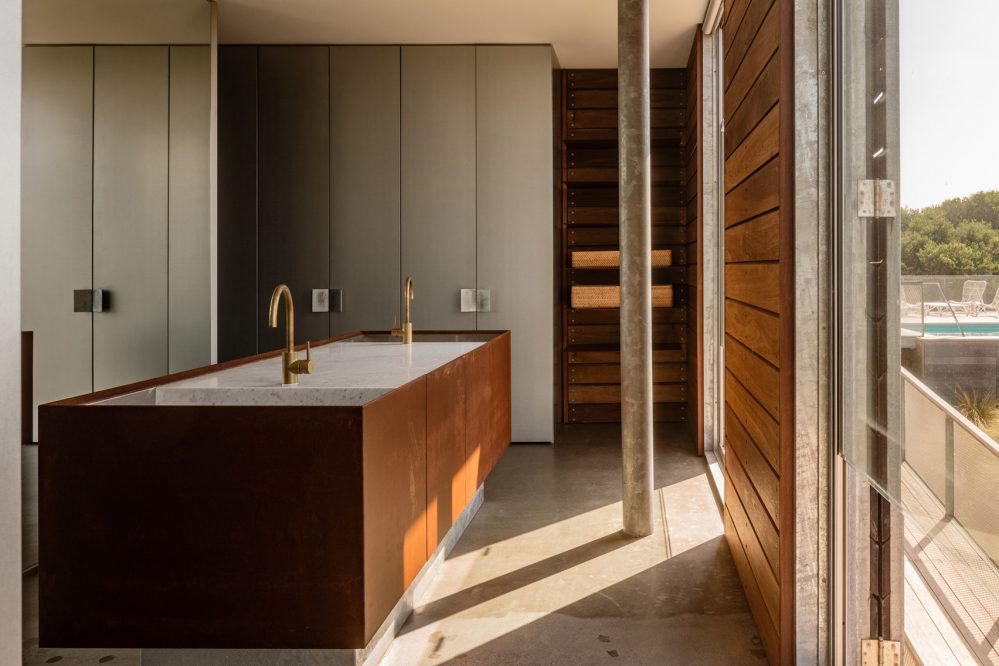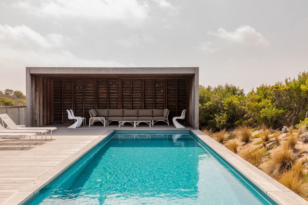 The entrance to St Andrews Beach Villa can be found on its sheltered rear facade, where a steel ramp leads up to a reception area and also to the outdoor swimming pool and cabana for relaxing or entertaining. The bedrooms of the home sit arranged along this more sheltered, northern side of the plan, while the glazed front provides far more exposure to the elements. The rear and sides of the villa have been clad with a rain screen of jarrah wood panels, through which north light can filter in and deliver an eye-catching aesthetic impact.