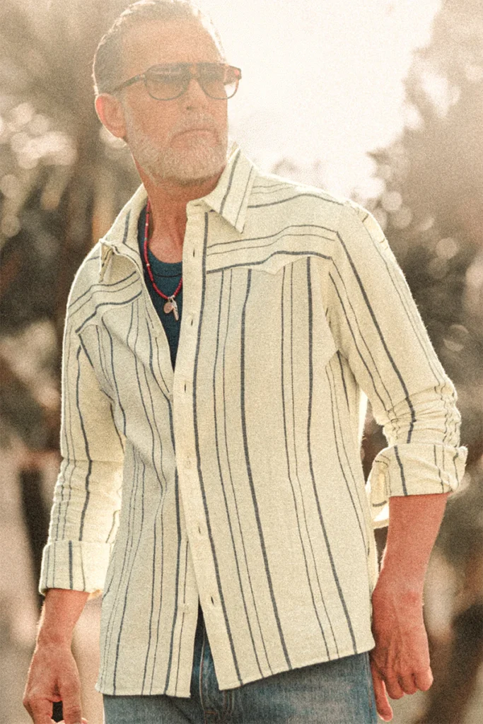 The Folsom Shirt Raw / Black Stripe carries the kind of structure that comes from purpose. The Western-style yoke sets the shoulders with a clean line, giving the shirt its frame. Elbow patches sit ready where wear shows first — built not as decoration, but as reinforcement.