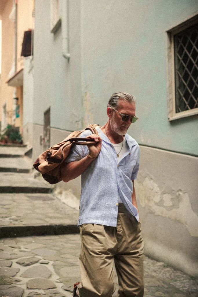 The Loreto Shirt White/Blue sits in that space between seasons. Light enough to wear on its own when the day opens up, easy to layer when there’s still a chill in the air. It’s cut from lightweight 90gsm cotton seersucker, chosen for its natural texture and breathable structure. The puckered surface lifts the cloth slightly from the skin, allowing air to move and giving the shirt its distinctive character.