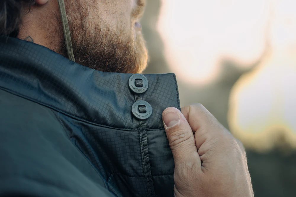 Design details and construction underscore TAD’s commitment to quality and functionality. The vest features quilted panels with the Power Fill insulation interior. The centre front utilises a button placket with TAD slotted signature buttons (30L), affixed with robust tubular flat lace – these are Canadian tape buttons designed for exceptional durability and quick, reliable in-field repairs. Side panels are built with robust ⅛” double needle stitching, while single needle edge stitching is used at overlays, pockets, and the collar. Elastic Binding at the cuff and hem provides a snug fit.
