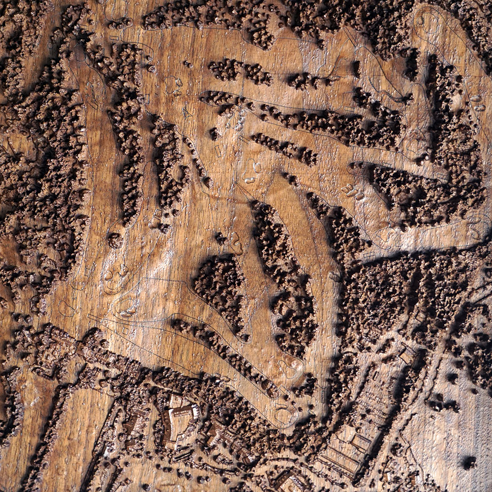 This rich, dark wood becomes the canvas for a meticulous process where CNC-routing technology carves the precise, three-dimensional contours of the course. The elevation changes, the bunkers, and the rolling hills are brought to life with a tactile quality you can feel with your fingertips.