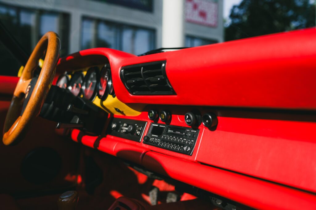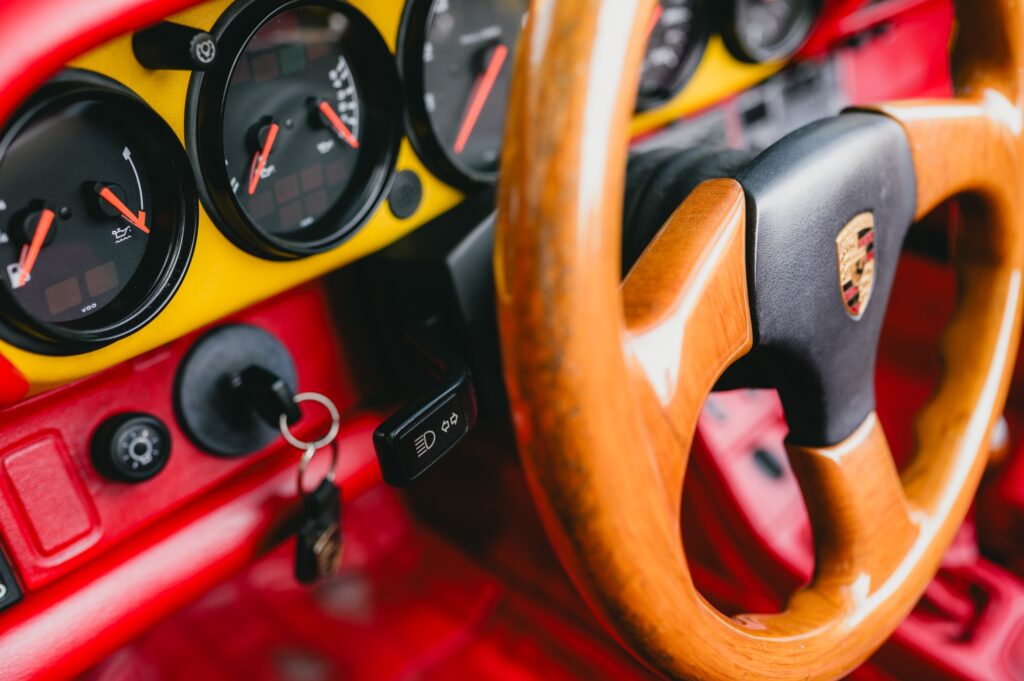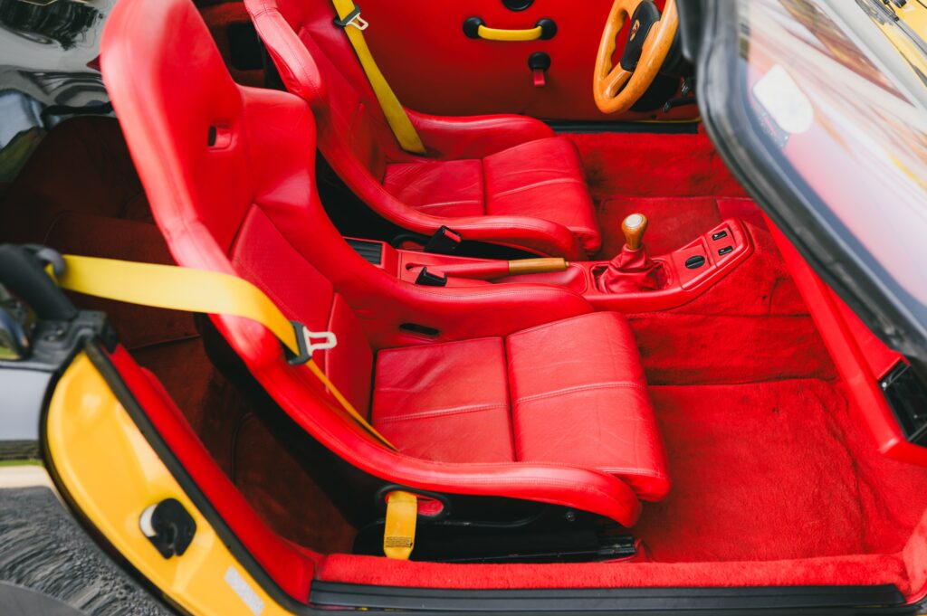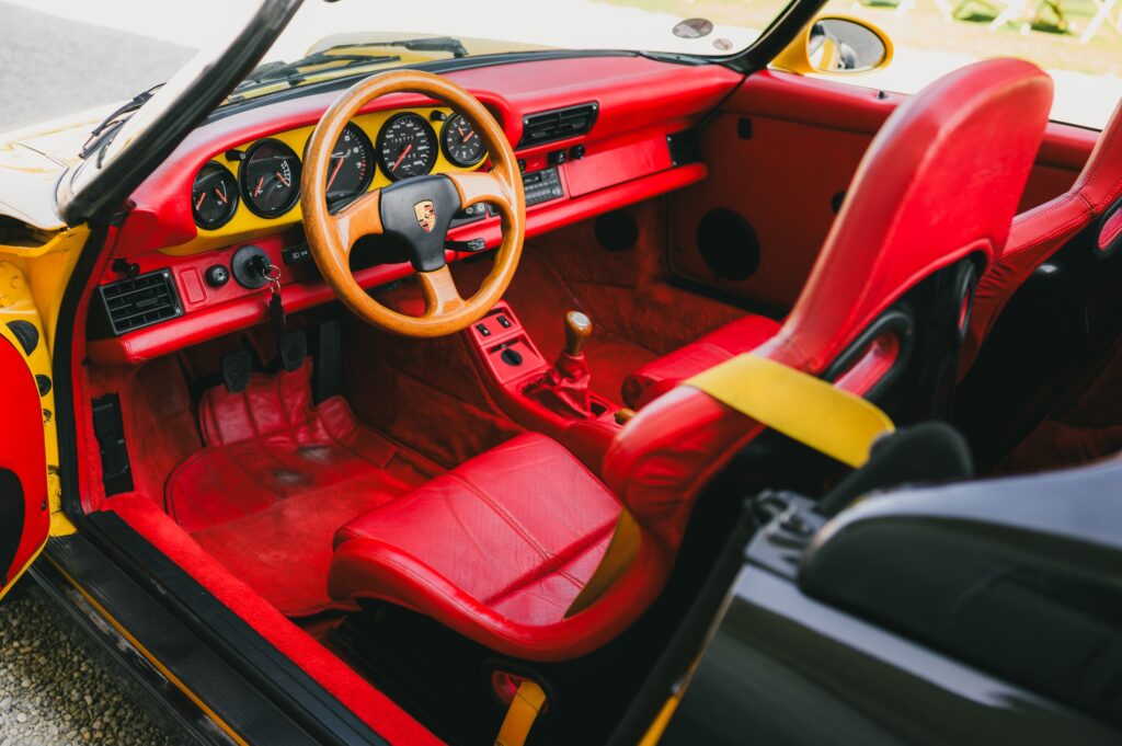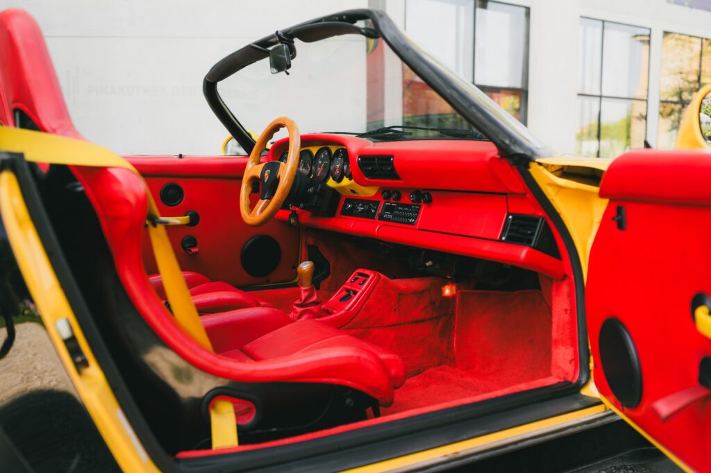 Drop that roof, however, and the bright red leather interior is exposed, completing a powerful colour triptych that perfectly reflects the colours of the German flag. The interior modifications are a masterclass in unique customisation, featuring Red Recaro RS seats and a dashboard accented with yellow.