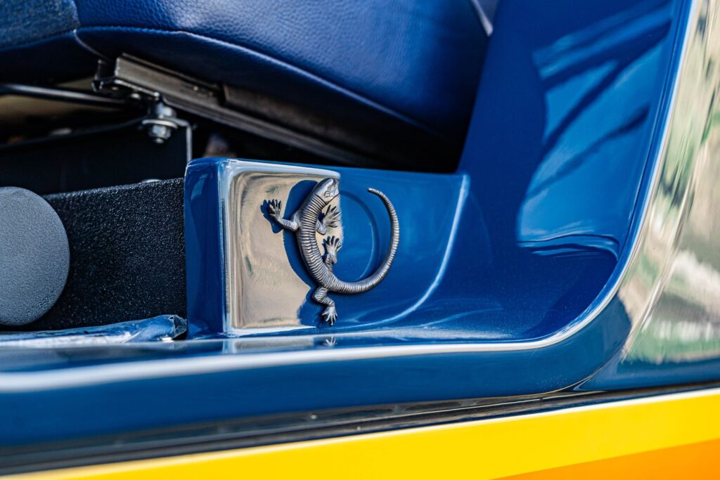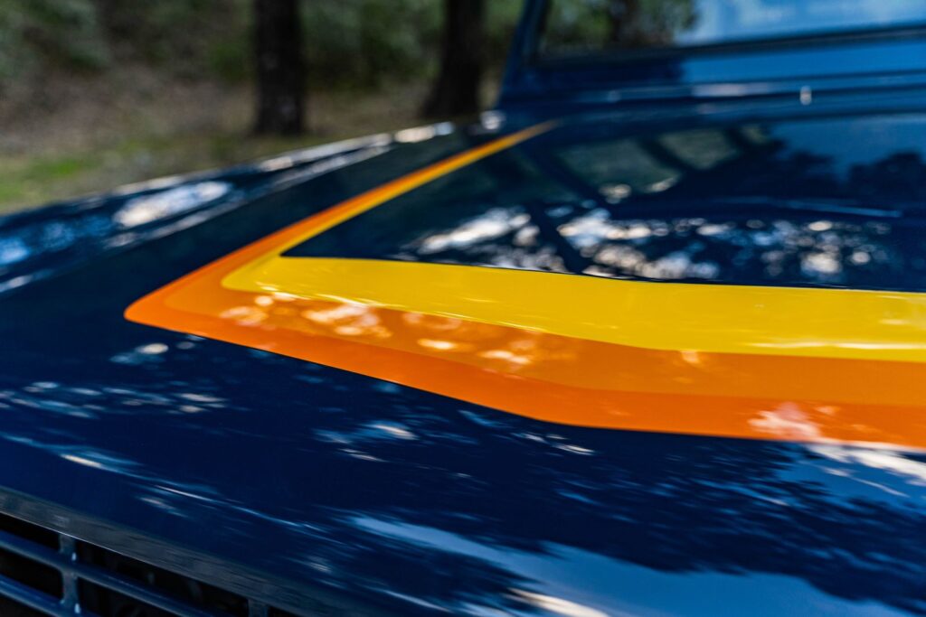 The custom vinyl seating features a stunning hombre-style pattern that introduces a warm palette of blue, orange, and gold, setting the tone for the vehicle’s accents. This colour scheme is thoughtfully woven throughout the interior, appearing on the centre console, seat hardware, rockers, and even the vintage-style hood. Ward explained the vision: “This project was about creating a subtle retro vibe where everything ties together beautifully.”