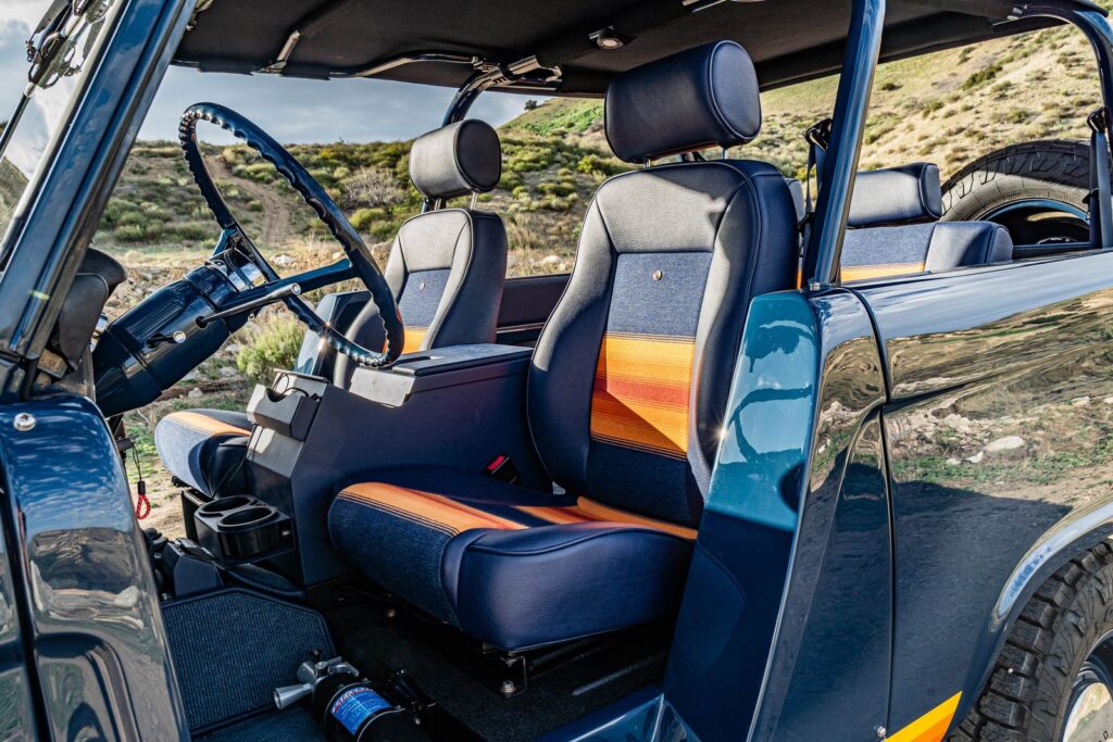 The design philosophy is a masterclass in cohesive, retro-inspired aesthetics. The entire vehicle is bathed in a stunning monochromatic blue, a theme that extends to the durable seven-layer laminated fabric soft top. Inside, the magic continues with a spectacular collaboration between ICON, Pendleton, and Sunbrella.