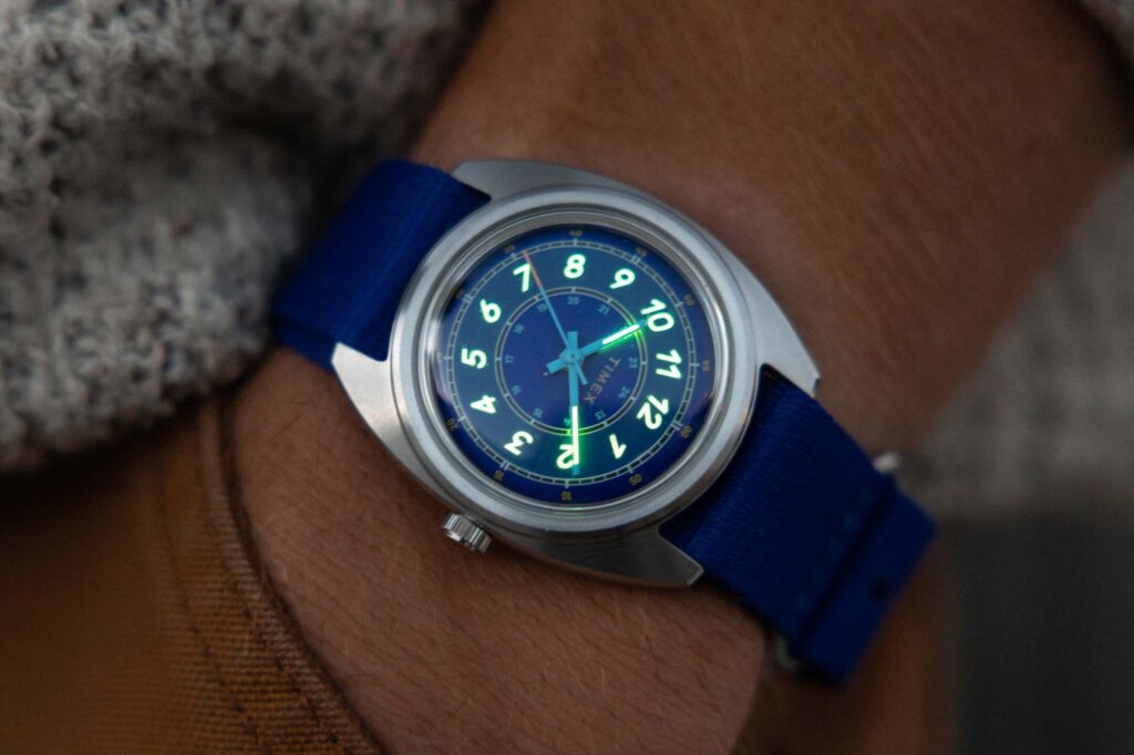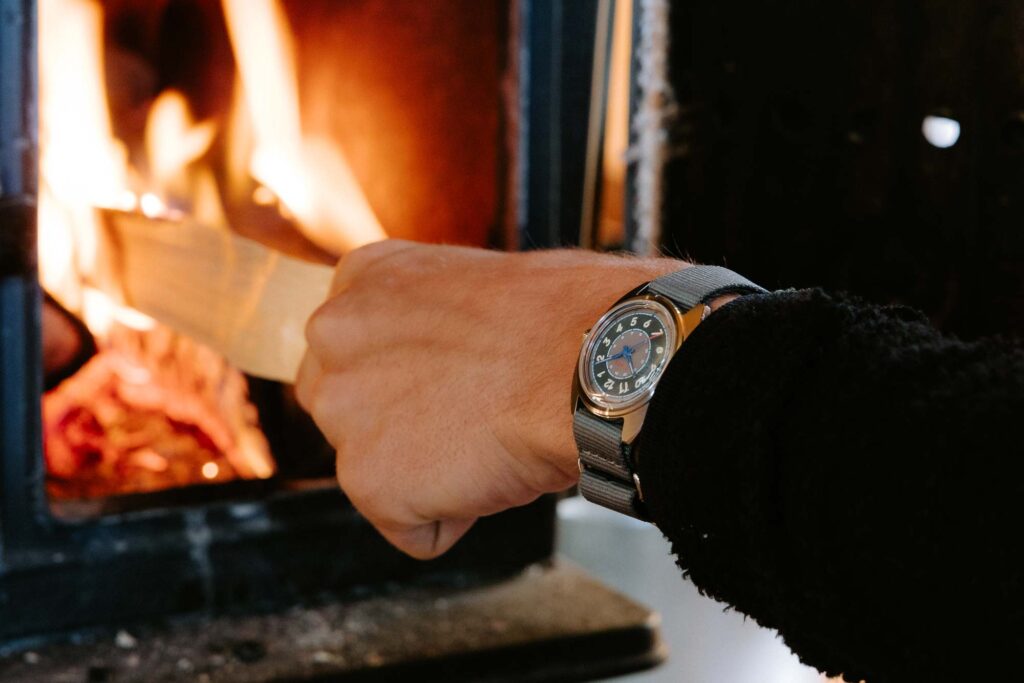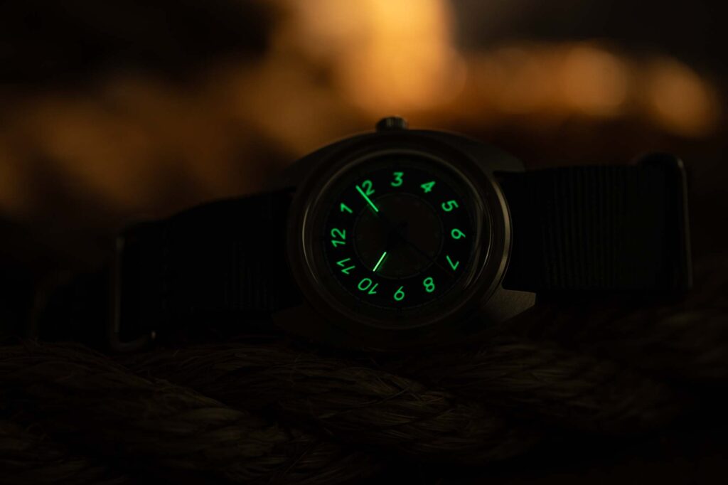 Functionality remains front and centre, even with the added visual flair. For those low-light visibility moments, the distinctive italic numerals are pad-printed with thick C3 lume, matched by the luminous hour and minute hands. This commitment to practical use ensures that despite its creative design, the watch holds true to the field watch spirit of practical, terrestrial usability.