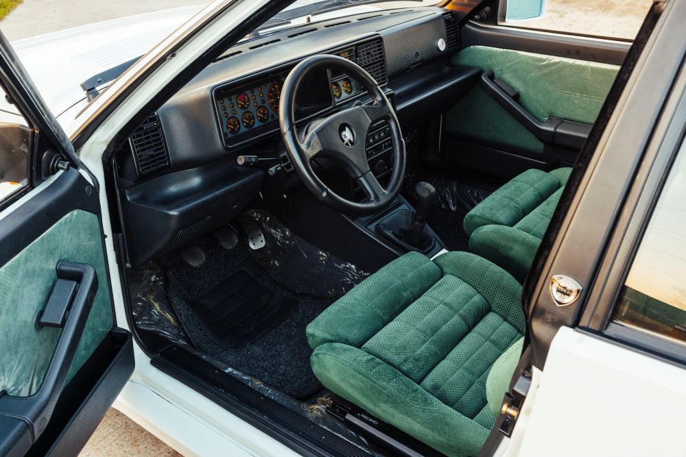 The car’s desirability is further amplified by its rare factory specifications. Finished in a beautifully understated combination of White over Green perforated Alcantara, it features a list of performance-focused options that are the stuff of legend, including Recaro seats, Bosch anti-lock braking, air conditioning, and a split rear seat. Crucially, it was ordered without a sunroof, a clear signal of its motorsport intentions.