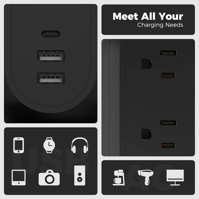 But a modern workspace runs on more than just standard AC plugs, and the TESSAN Tower understands this implicitly. Integrated into its sleek chassis are three USB charging ports, including a high-speed USB-C port capable of 3A output and two USB-A ports. This means you can free up those AC outlets for heavier appliances while your phone, tablet, and smartwatch juice up directly from the tower.