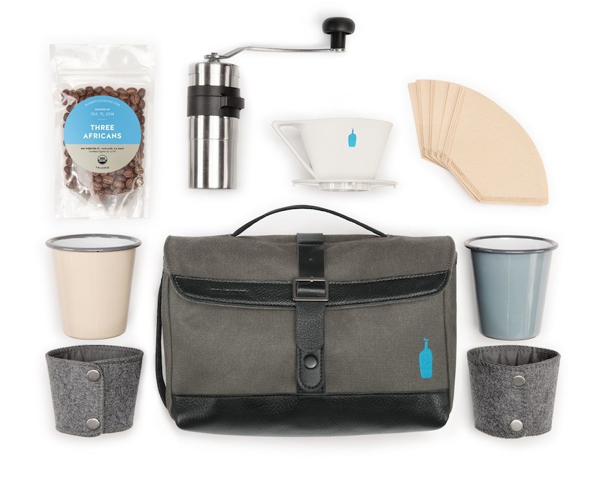 Included within the kit is a 2oz sample of Blue Bottle’s Three Africans drip blend, along with a Blue Bottle Coffee subscription discount card, Porlex Mini Hand Grinder, Blue Bottle Travel Dripper, 2 Falcon Enamelware Tumblers and 2 Timbuk2 Zarfs – a pretty solid list, we’re sure any coffee aficionado will agree. Check out a few shots of the kit below: