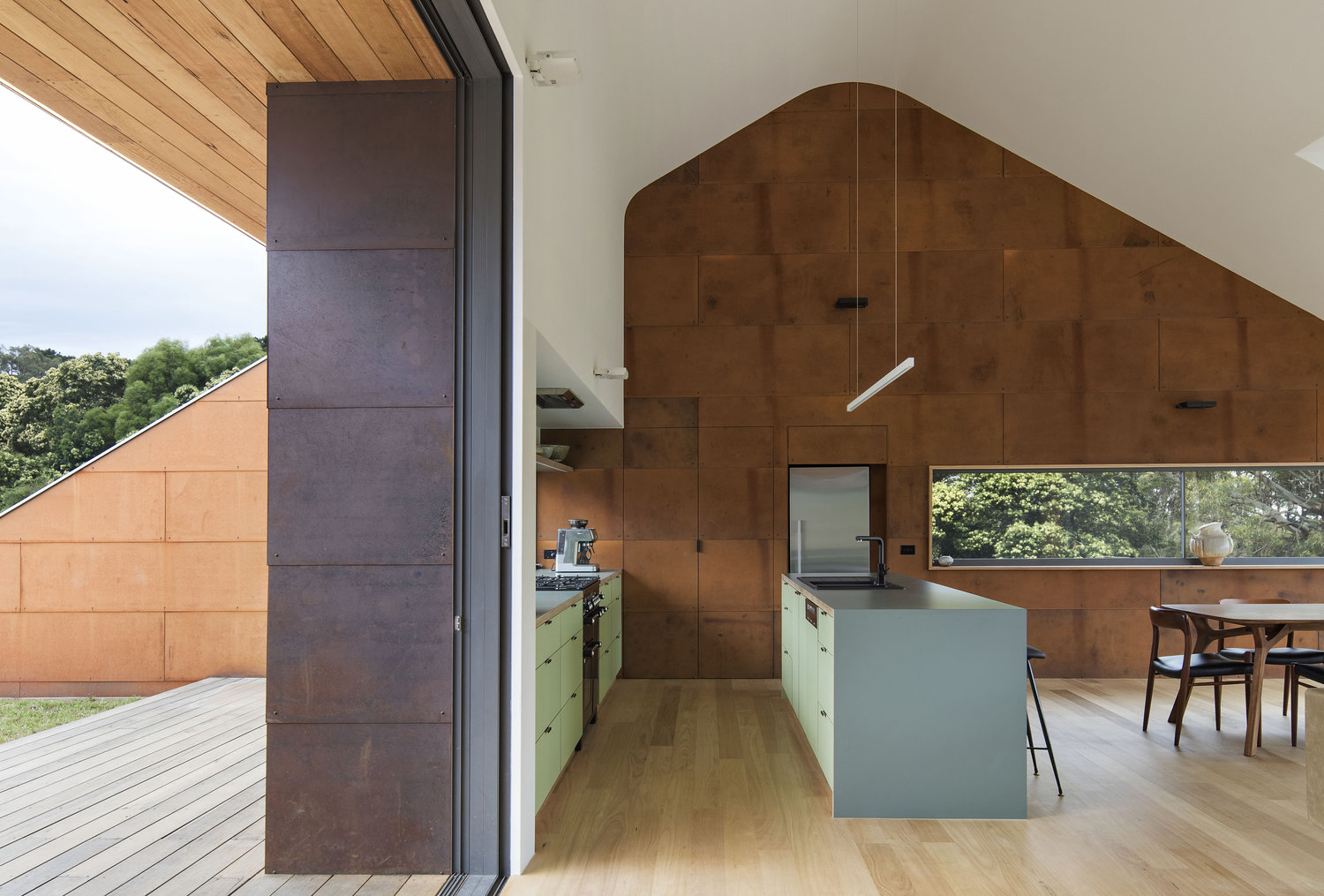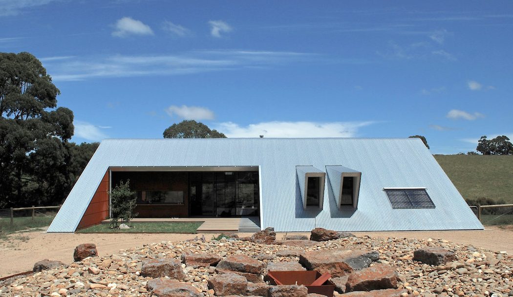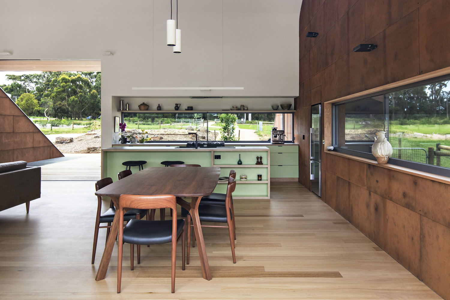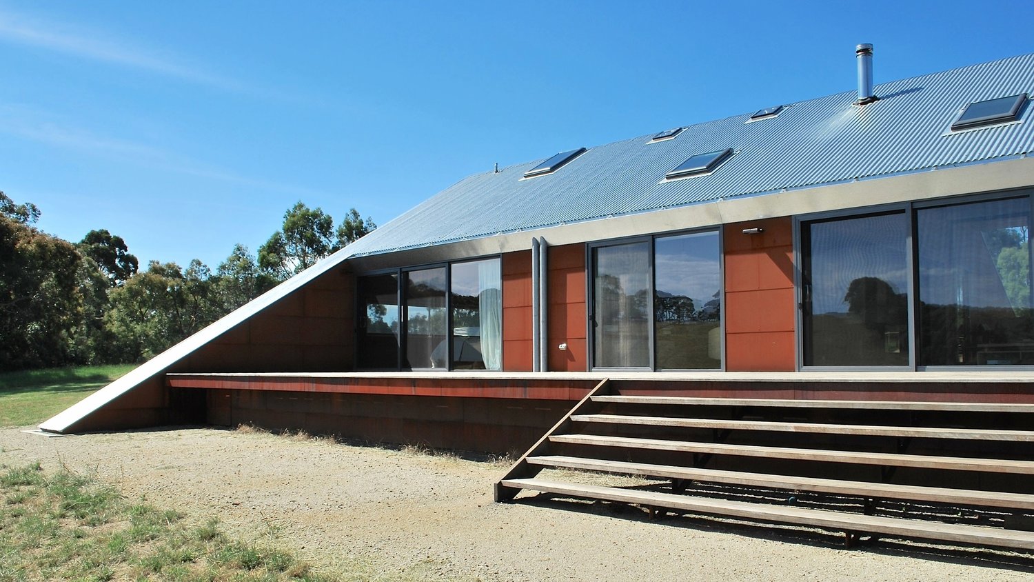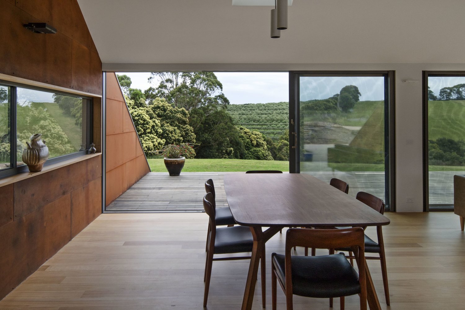There are great design touches throughout the Tucks Ridge House such as how the undulating form of the landscape and forest canopy is effortlessly integrated into the building’s striking roof of industrial looking, galvanised steel. The roof acts as a mirror to the sky, an aero foil to the winds and in some lights, it can appear to seamlessly blend in with the sky above. The clever nature of the architectural design means that Tucks Ridge House often appears to blend into the landscape from certain perspectives and that’s something which helps it not jar the eye.