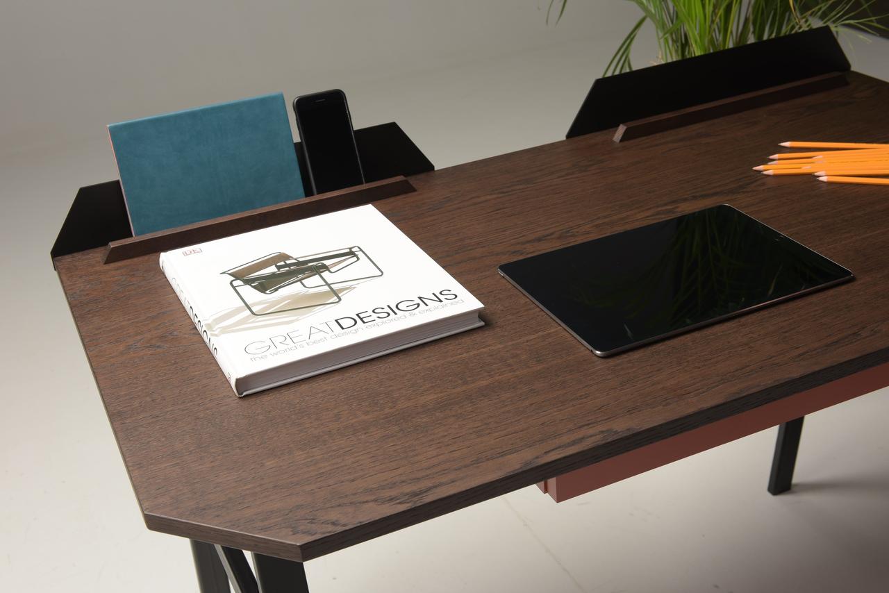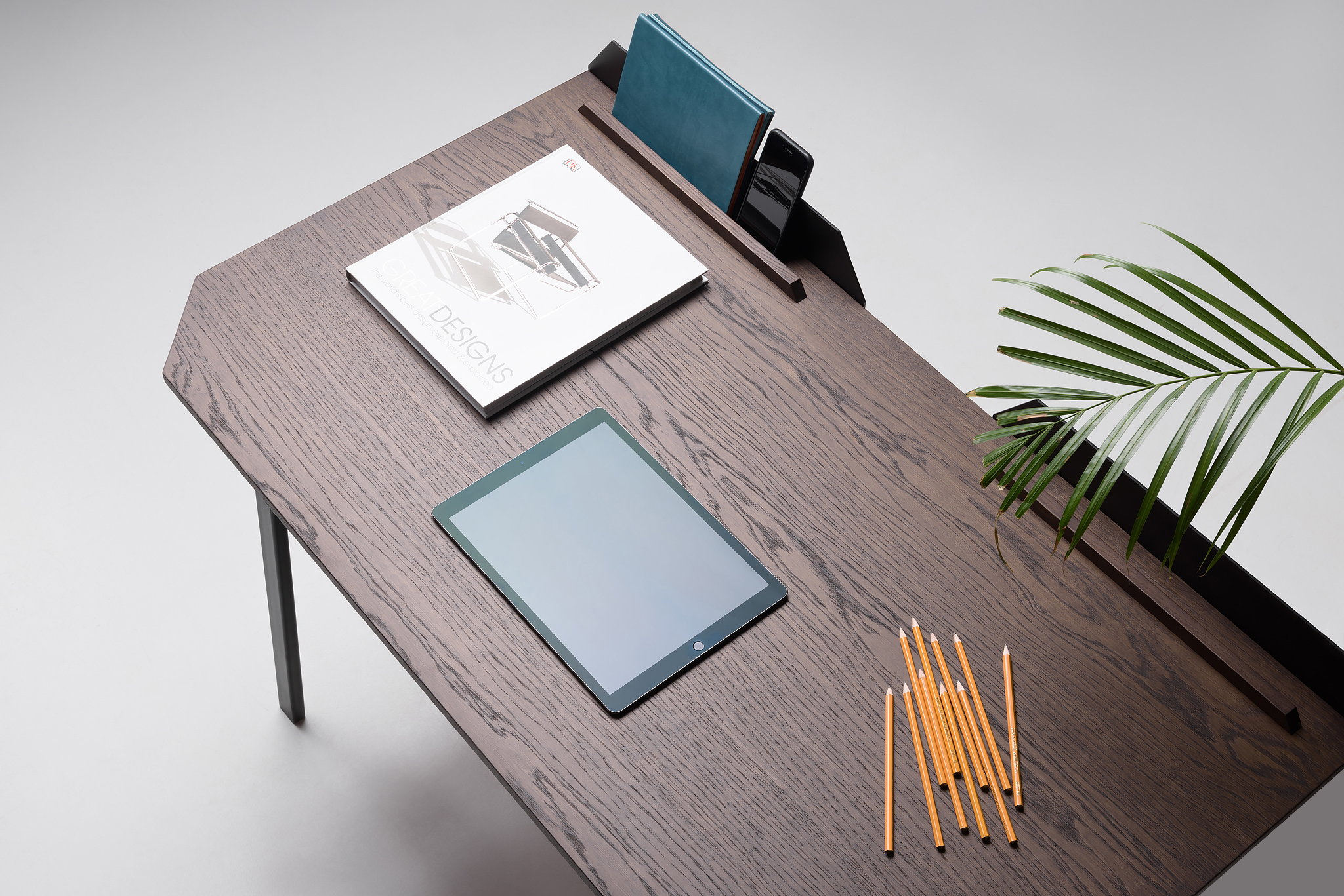 The contemporary design of the Pavel Vetrov designed UFO Lift Desk is coupled with an integrated vertical storage and display system which delivers an easy sight line to their sidekick mobile device screens such as smartphones, iPads and so forth. This fantastic piece of furniture design has a bold metal frame with a wood top design and a two-button lift motor which lets users switch between sitting and standing. A versatile metal stands is situated at the back of the desk surface and is designed to hold your EDC such as phones, keys, tablets and wallets.