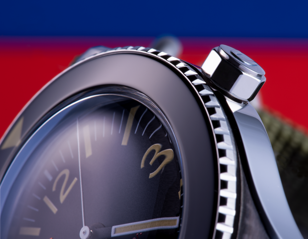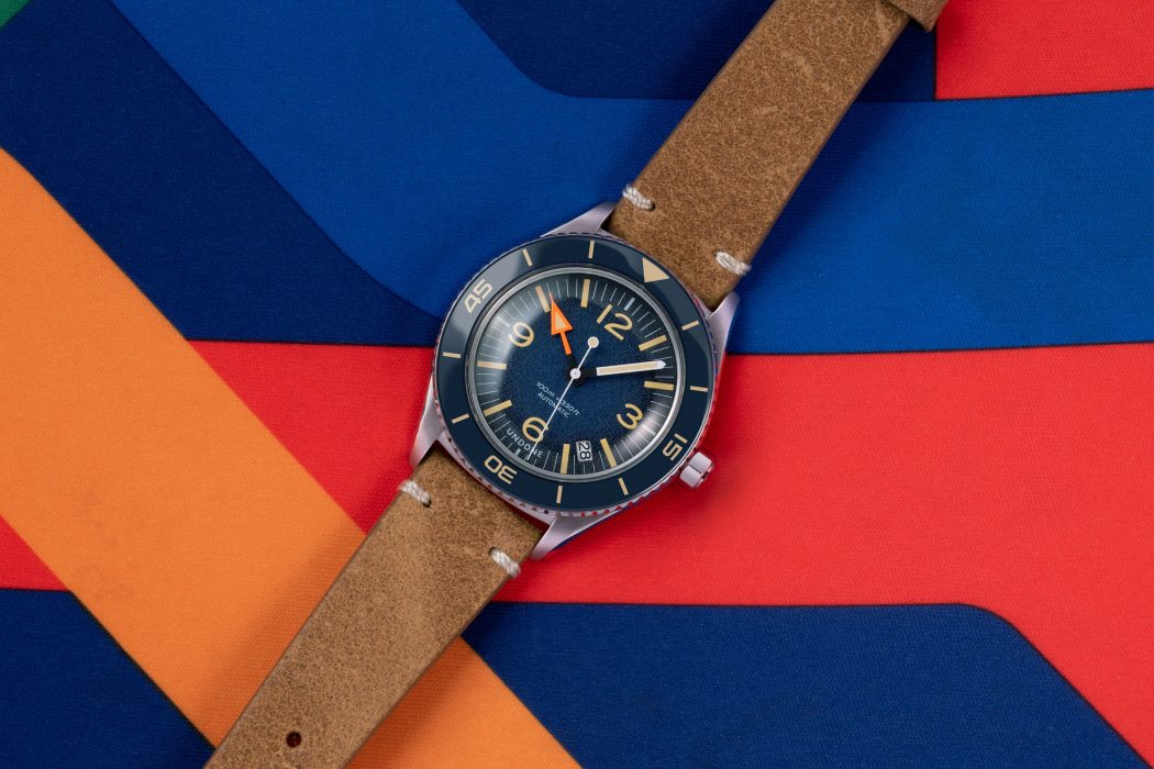 At a glance this dial will appear the typical California design in so much as it’s highly legible, slightly barmy and eclectic. However, when you catch it in the right lighting and you’ll discover that the blank area reveals a striking and intricate waffle pattern normally found on dress watches. Consisting of fine lines that allow the light to explore deeper and bring an added dimension to the dial. At first it has your curiosity, then it has your full blown attention.